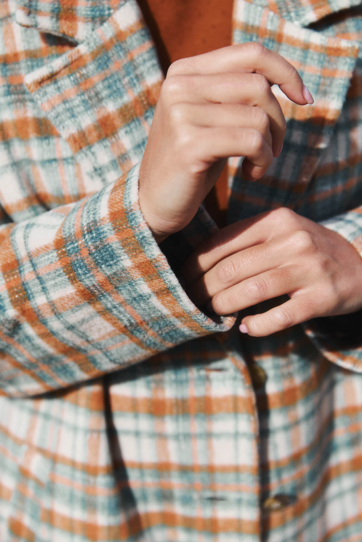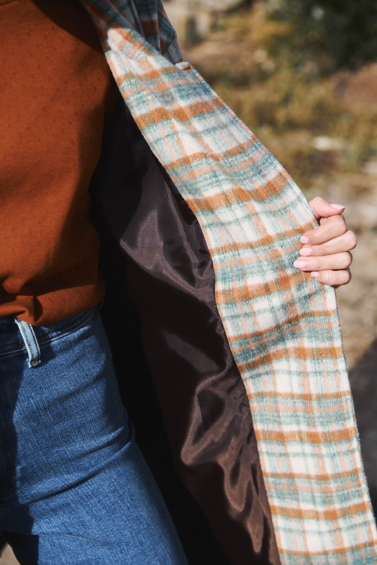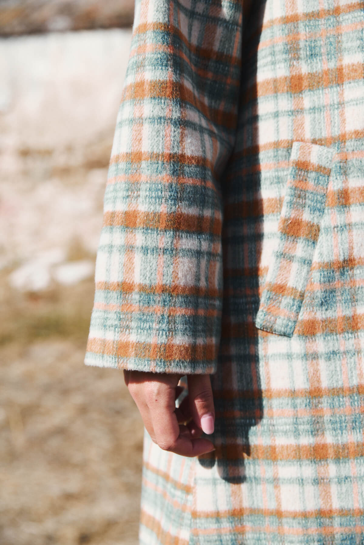El estampado de cuadros en tonos verde agua, caldera y crudo le da ese aire retro que destaca sin esfuerzo y combina con todo.