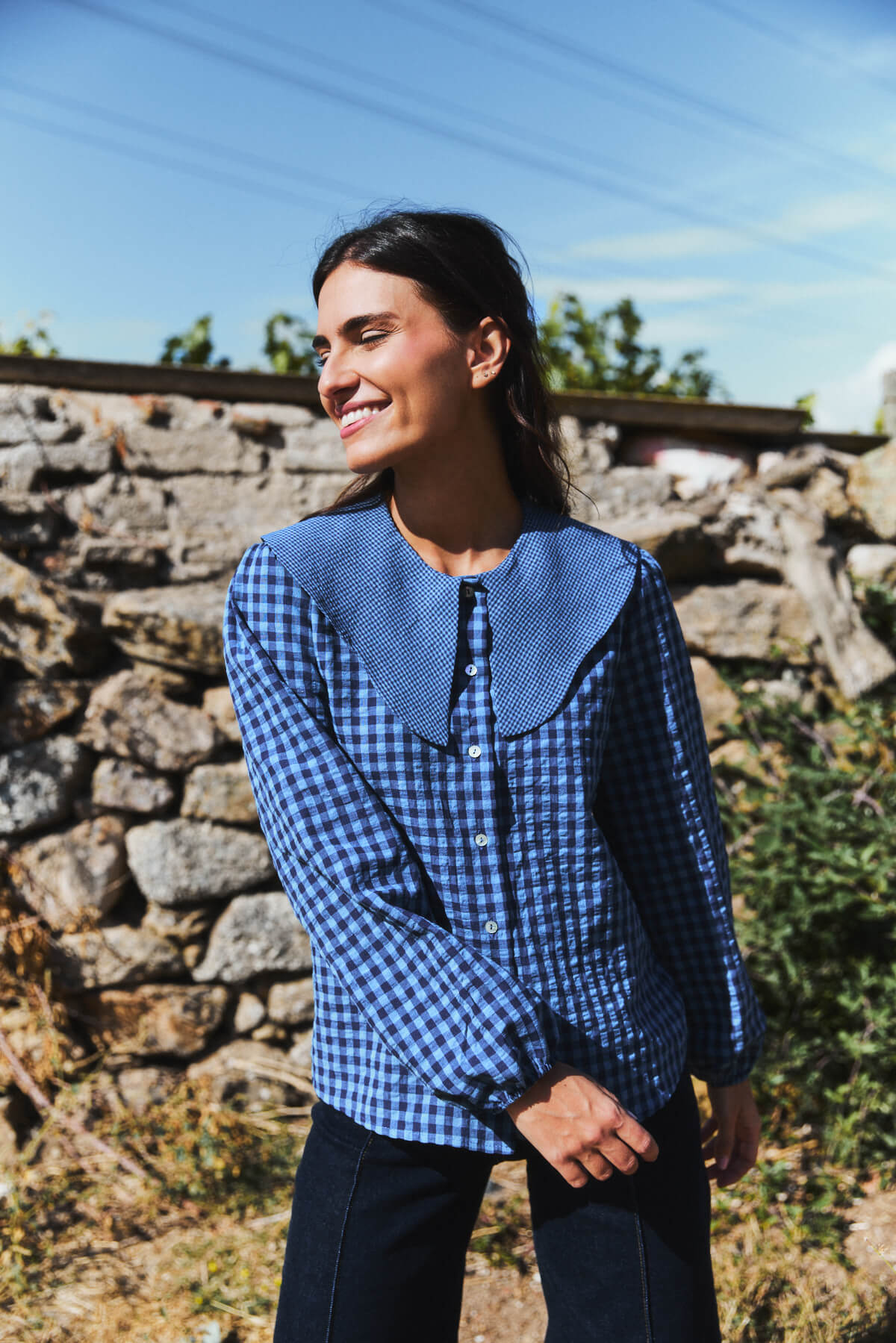 El gran cuello redondeado, confeccionado en un vichy más fino, aporta contraste y personalidad, mientras que el cuerpo de cuadros medianos en azul y marino mantiene un aire fresco y atemporal.