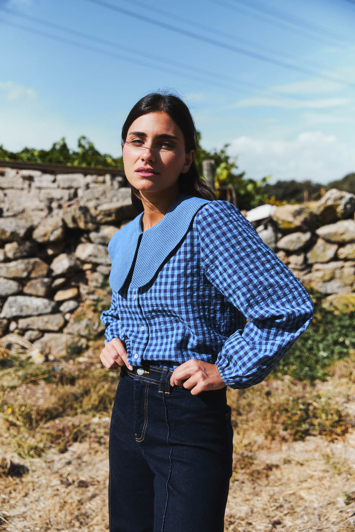 Esta blusa combina el encanto del vichy clásico con un toque contemporáneo que la hace especial.