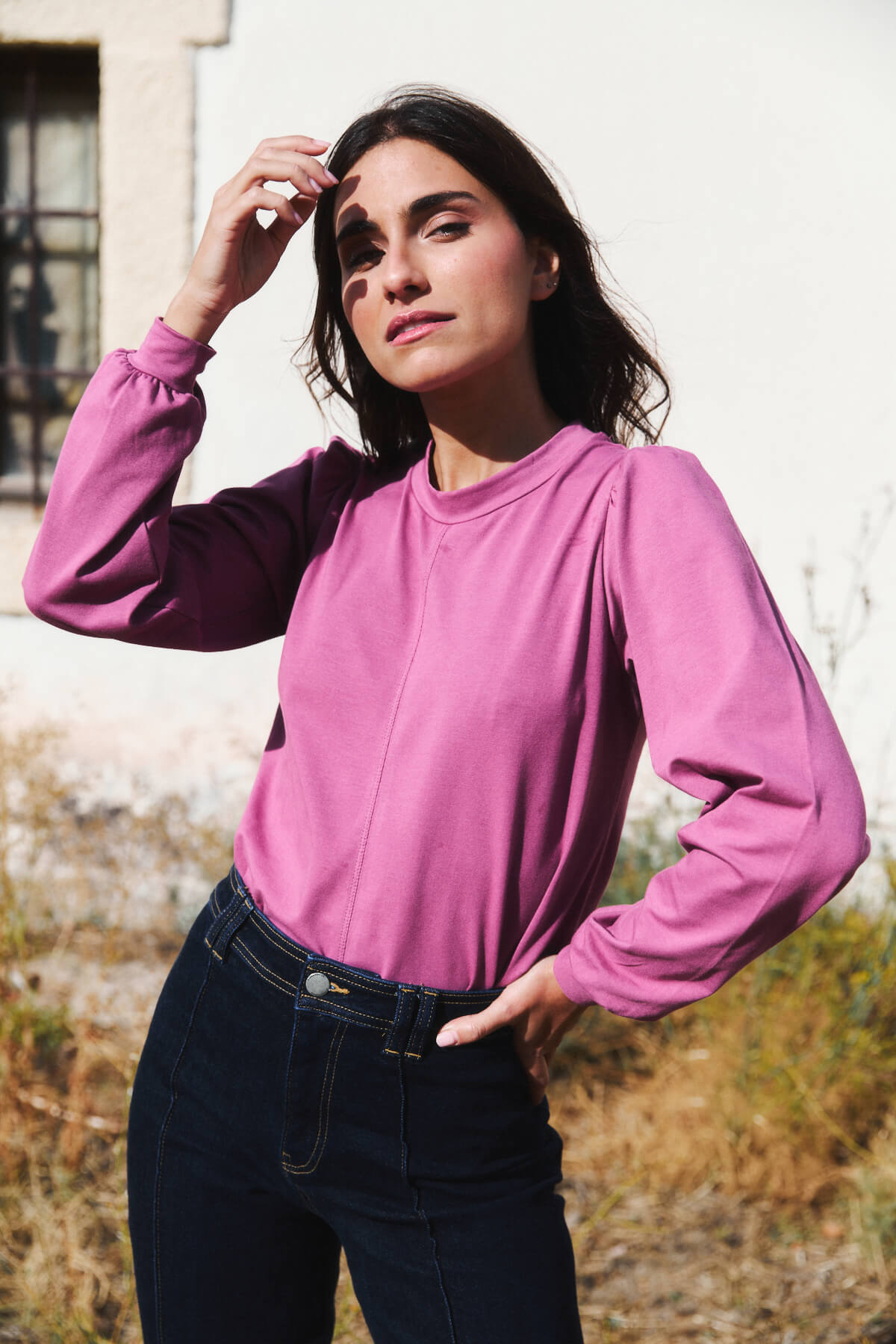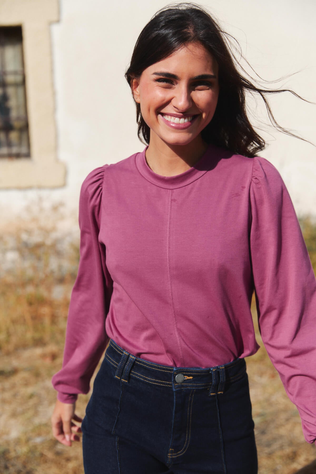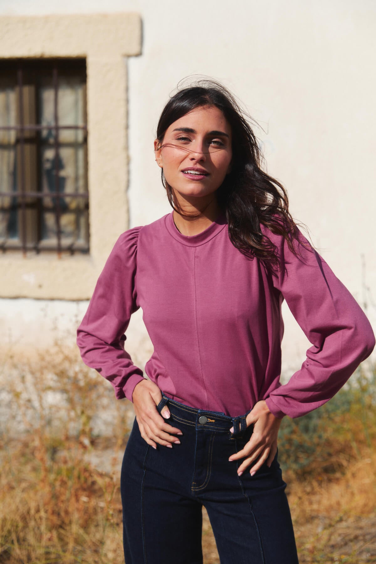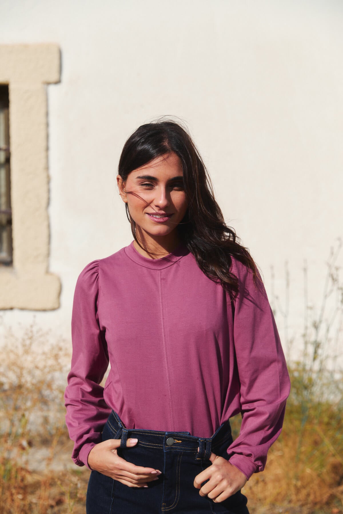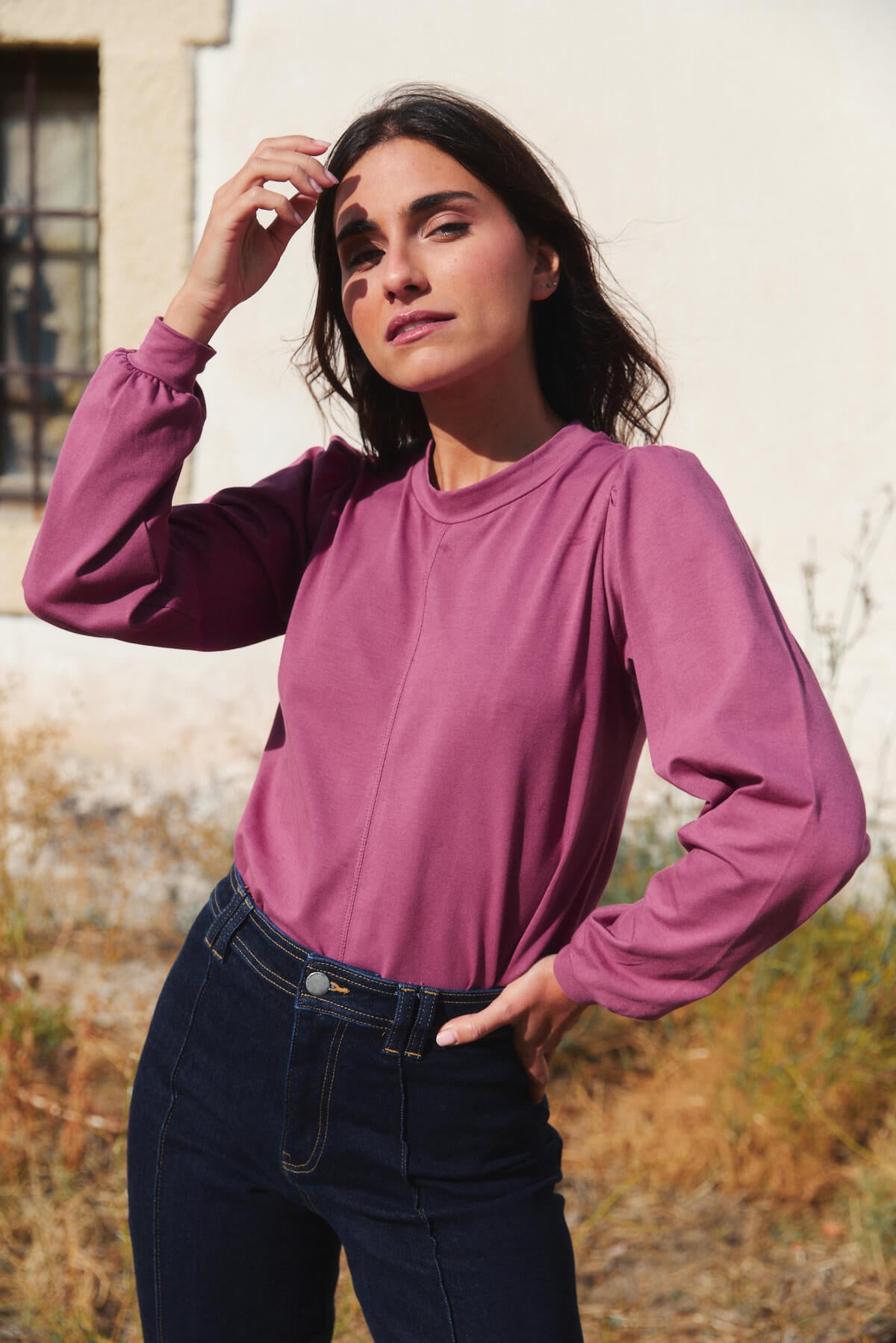 El cuello ligeramente subido y las mangas con volumen aportan un aire sofisticado sin renunciar a la naturalidad.