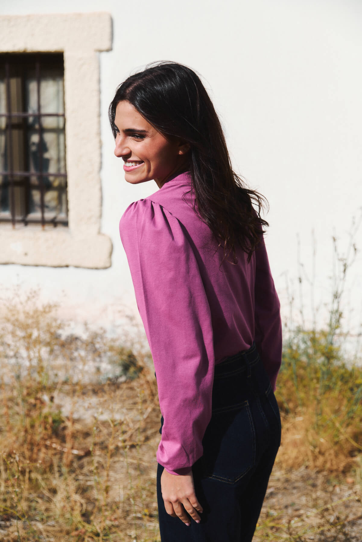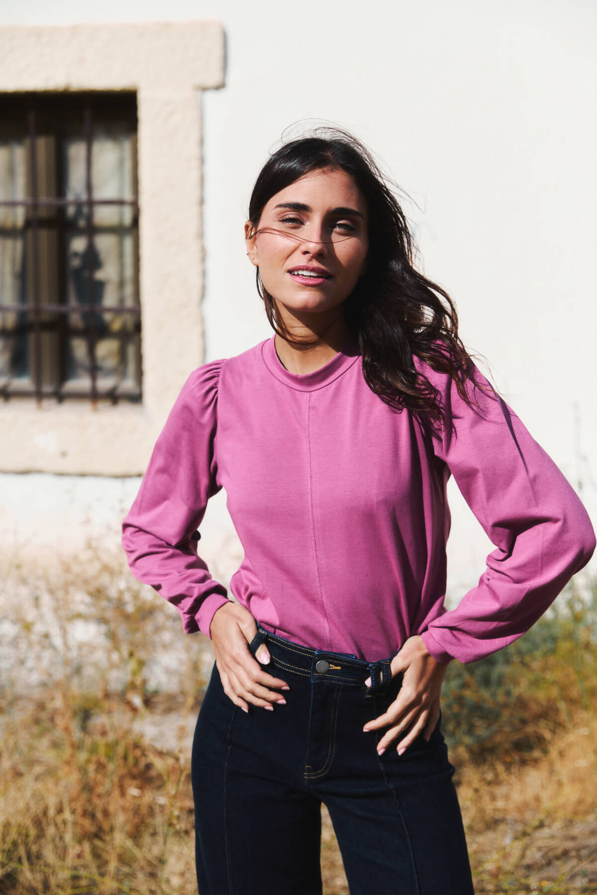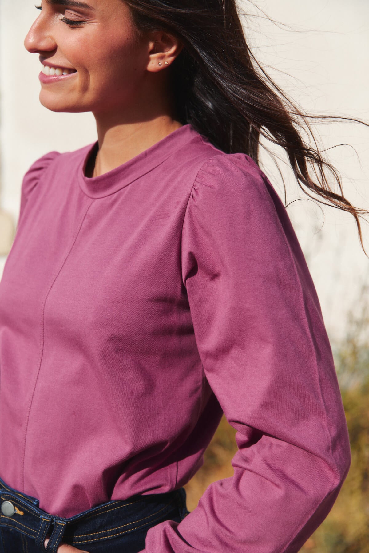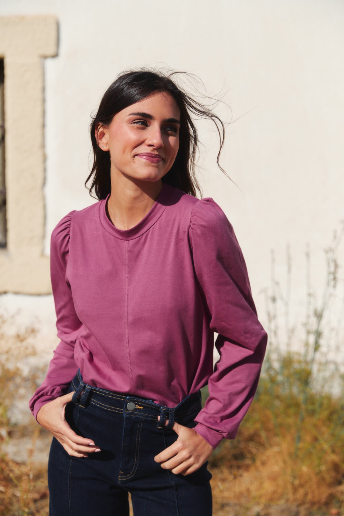 El cuello ligeramente subido y las mangas con volumen aportan un aire sofisticado sin renunciar a la naturalidad.