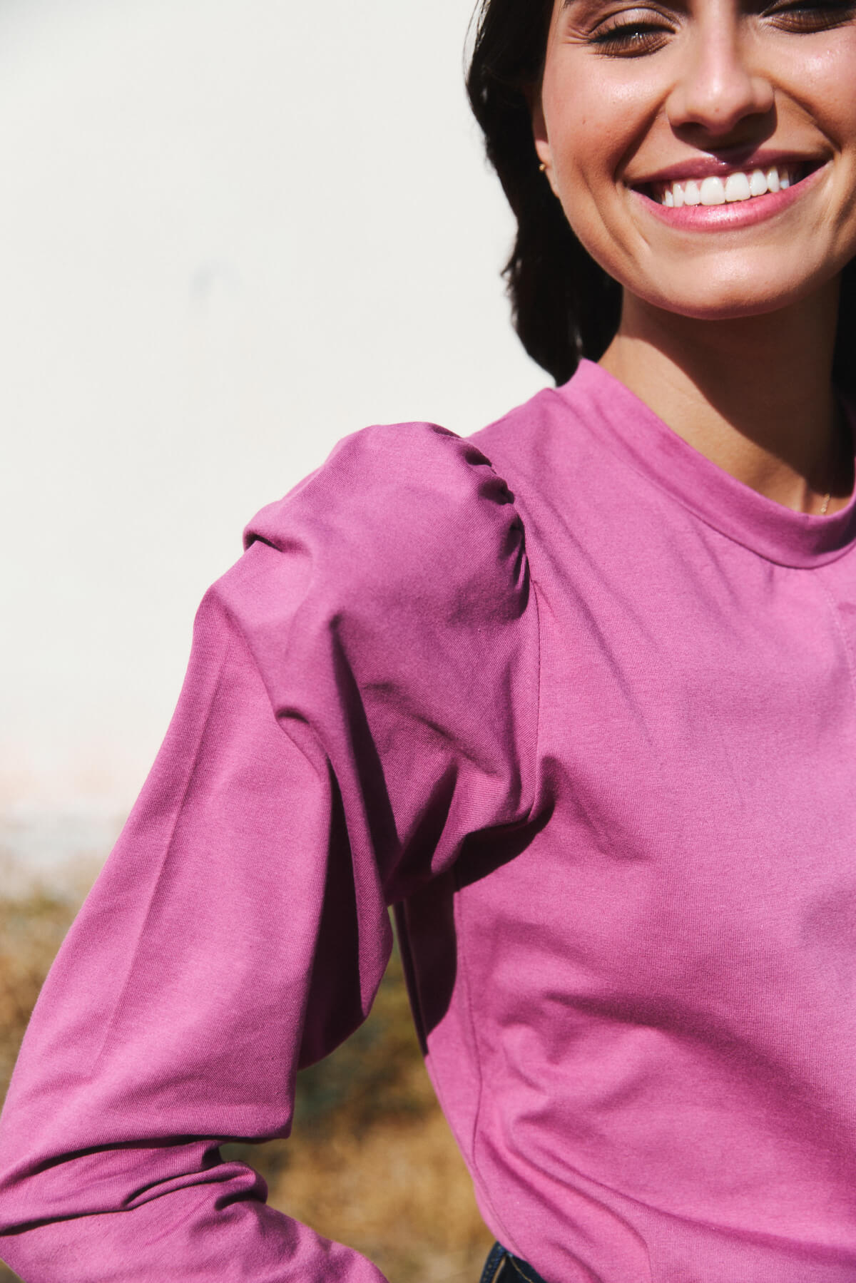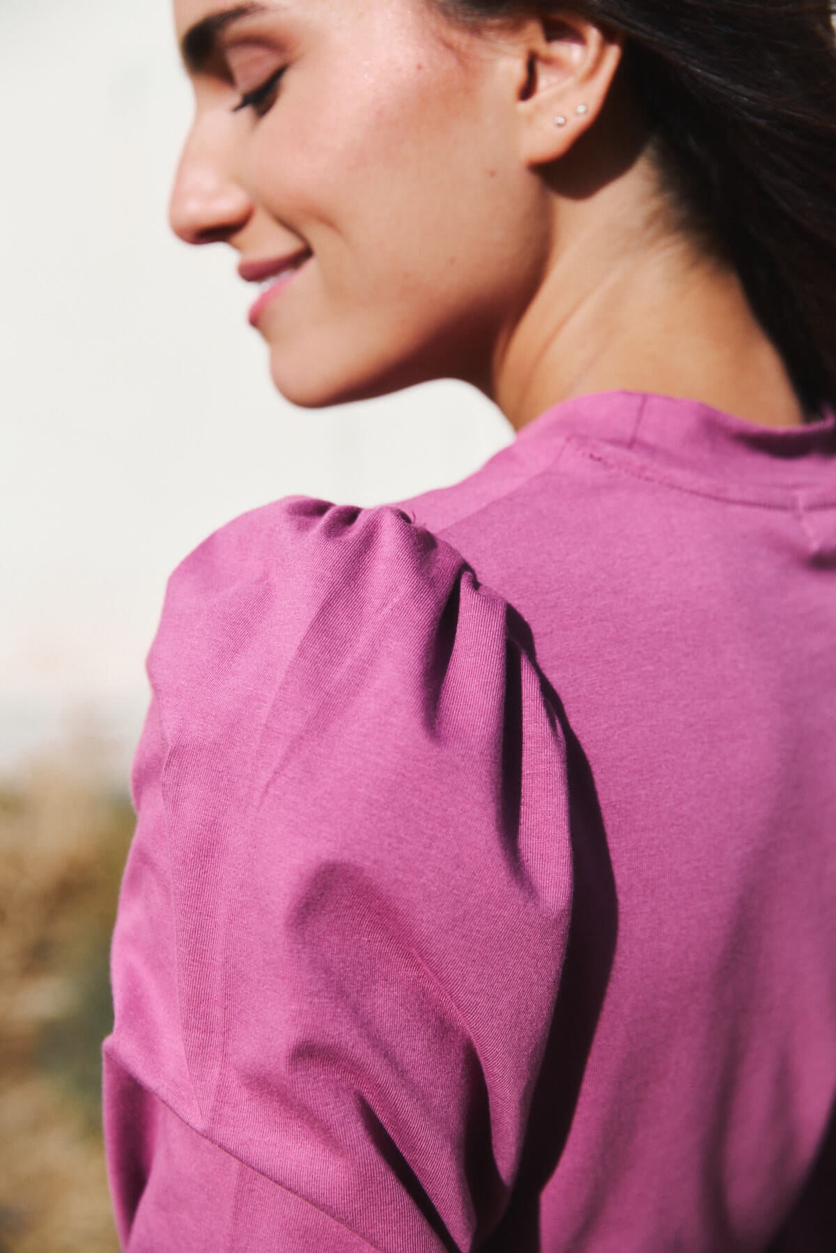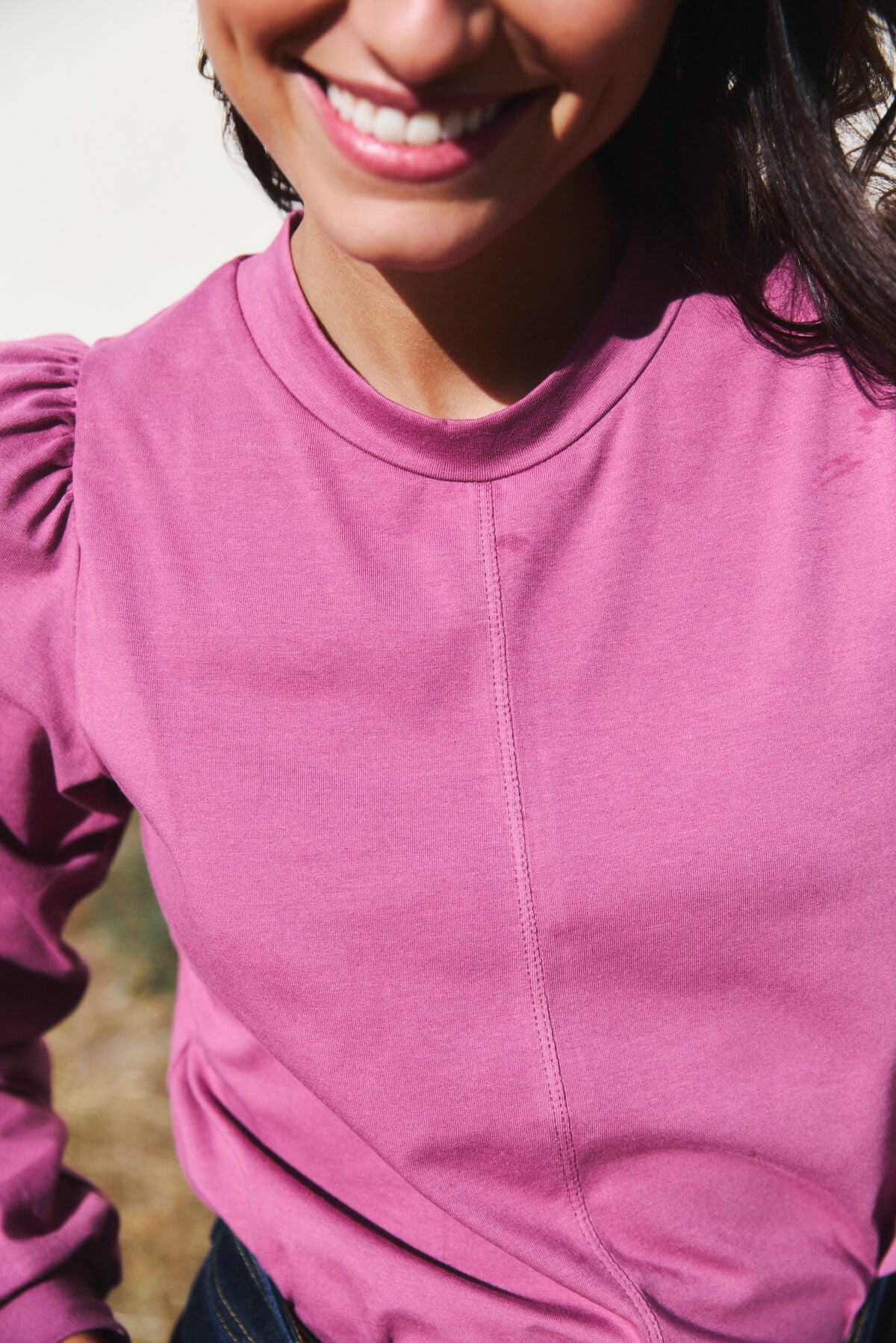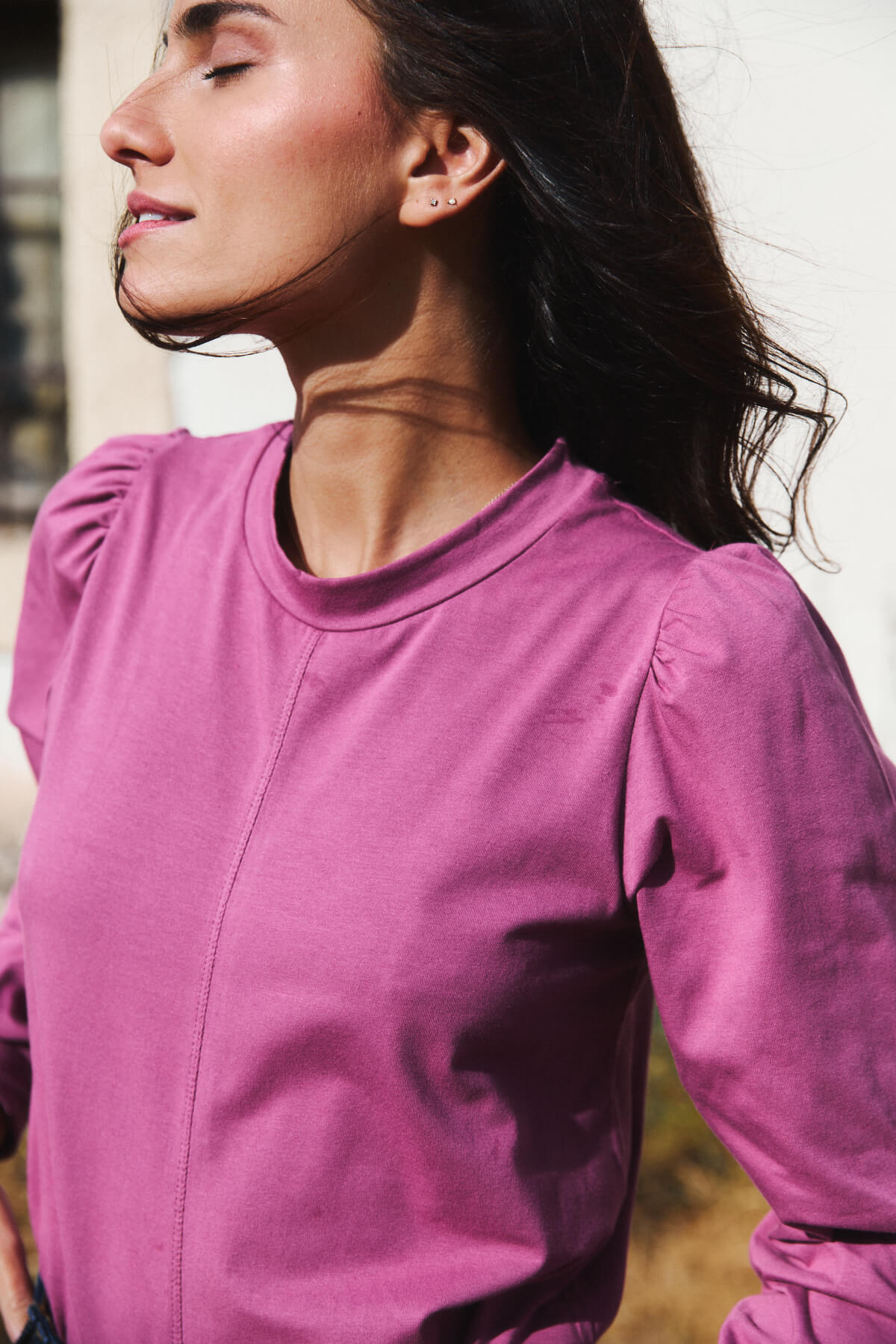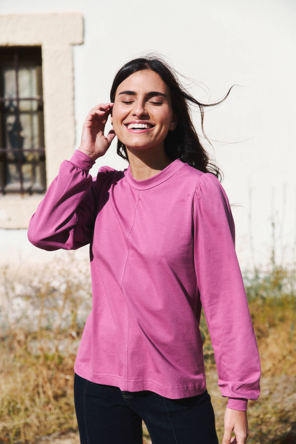 El cuello ligeramente subido y las mangas con volumen aportan un aire sofisticado sin renunciar a la naturalidad.