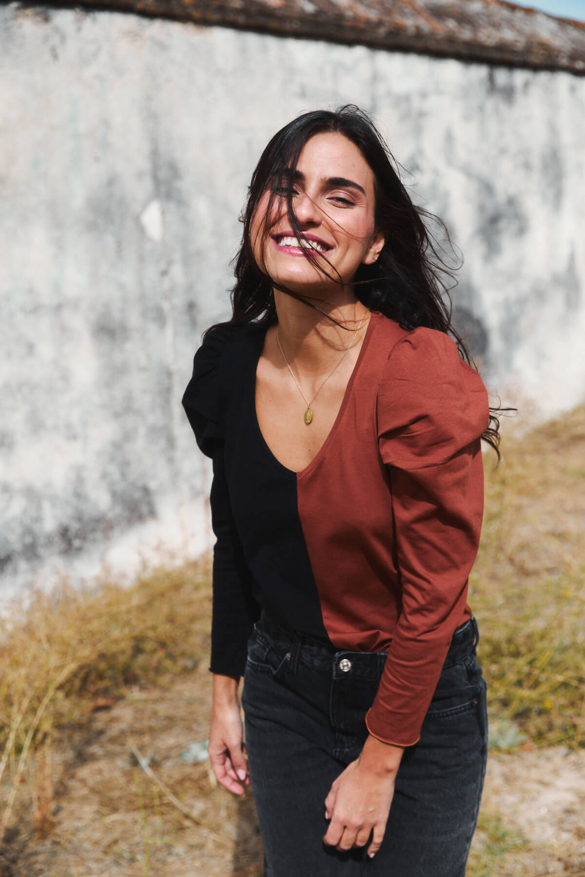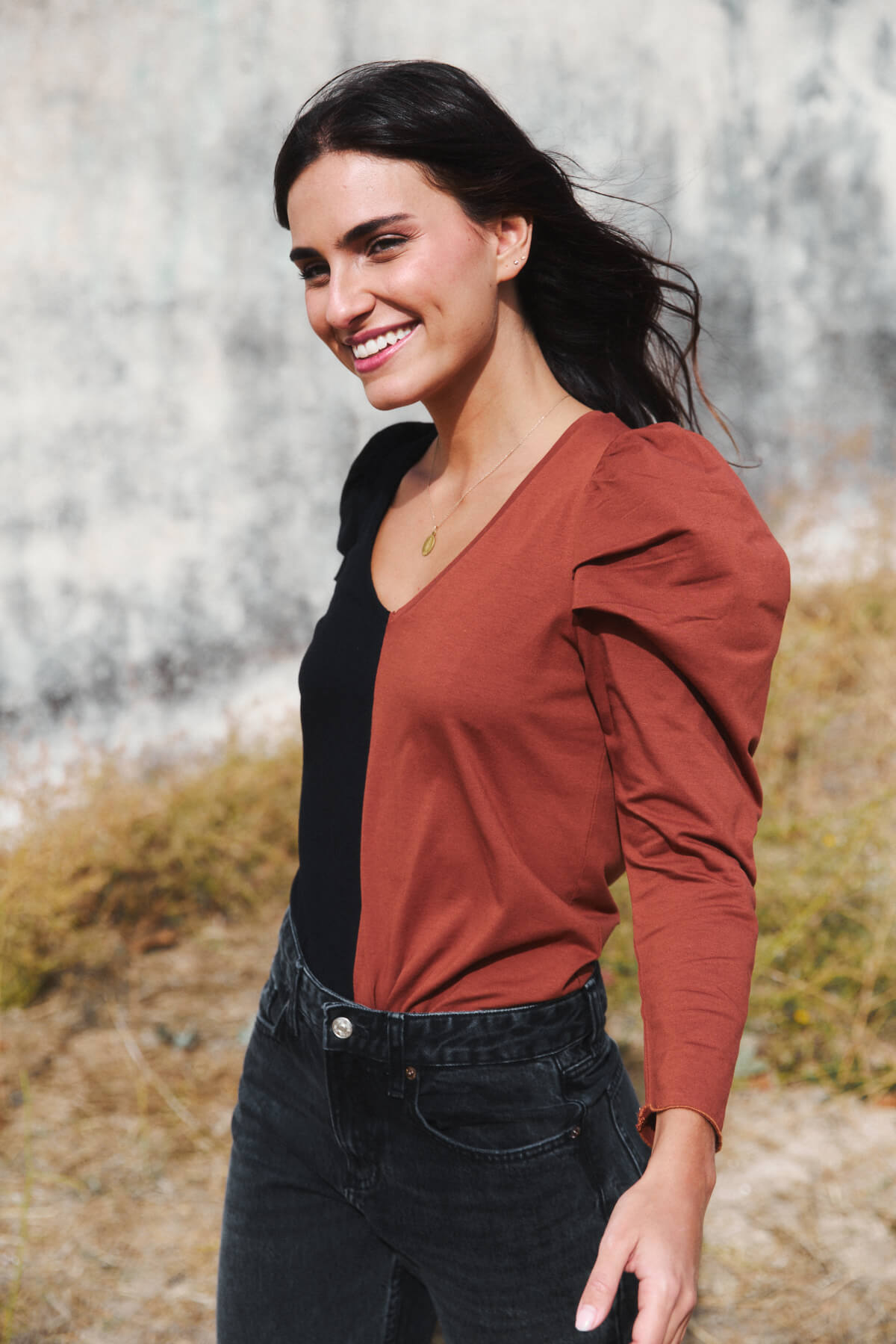 Su diseño con escote en pico y mangas ligeramente abullonadas consigue un equilibrio perfecto entre lo femenino y lo actual.