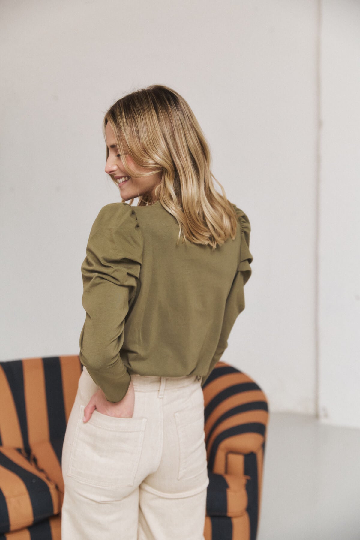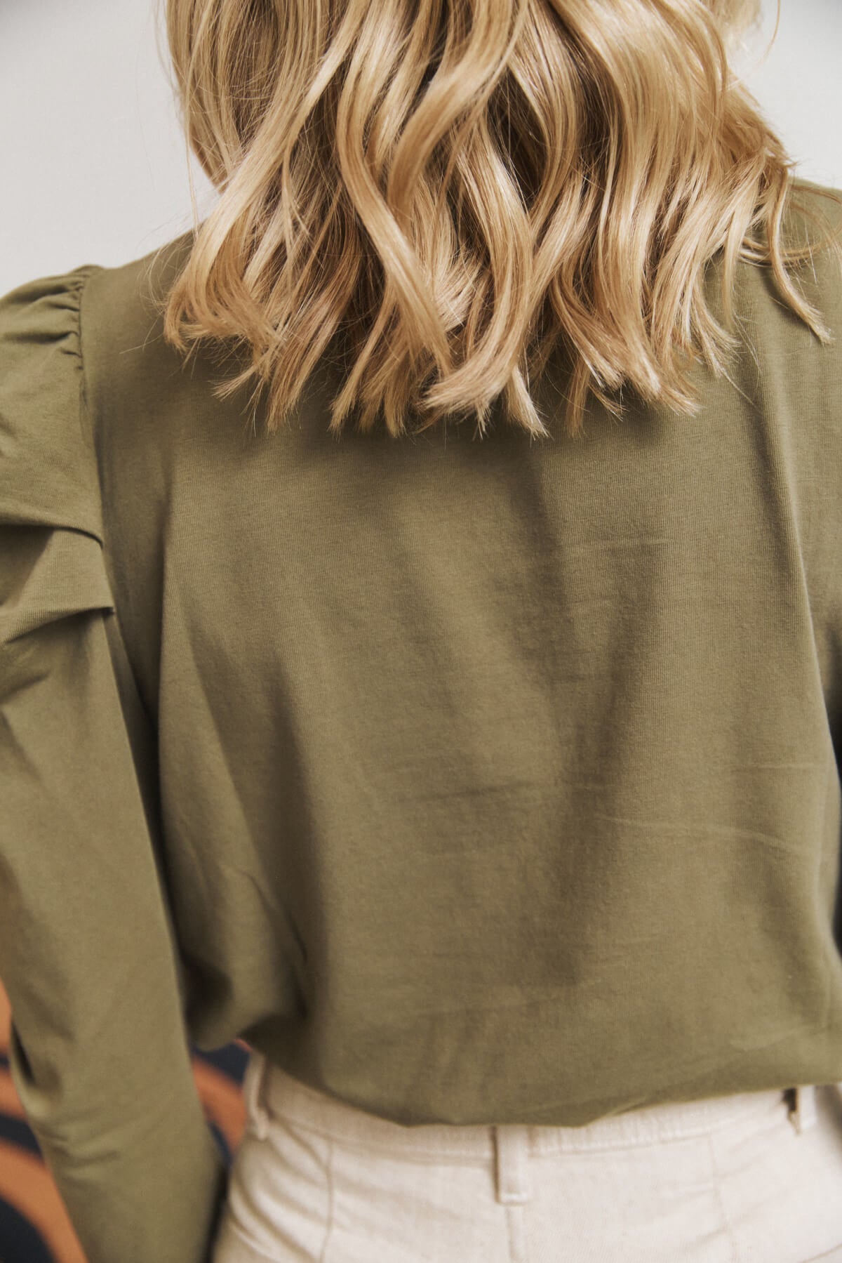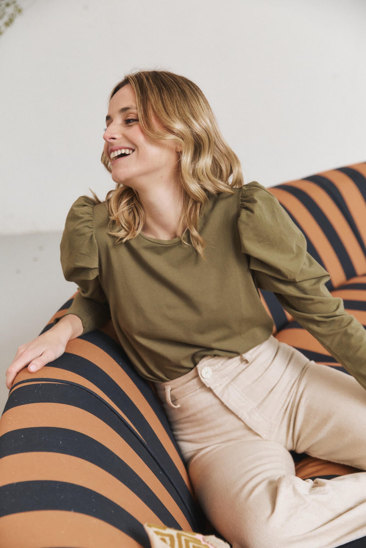 Esta camiseta destaca por su diseño cuidado y esos pequeños detalles que elevan cualquier look. El volumen sutil en los hombros aporta estructura y un aire especial, sin perder comodidad ni naturalidad.