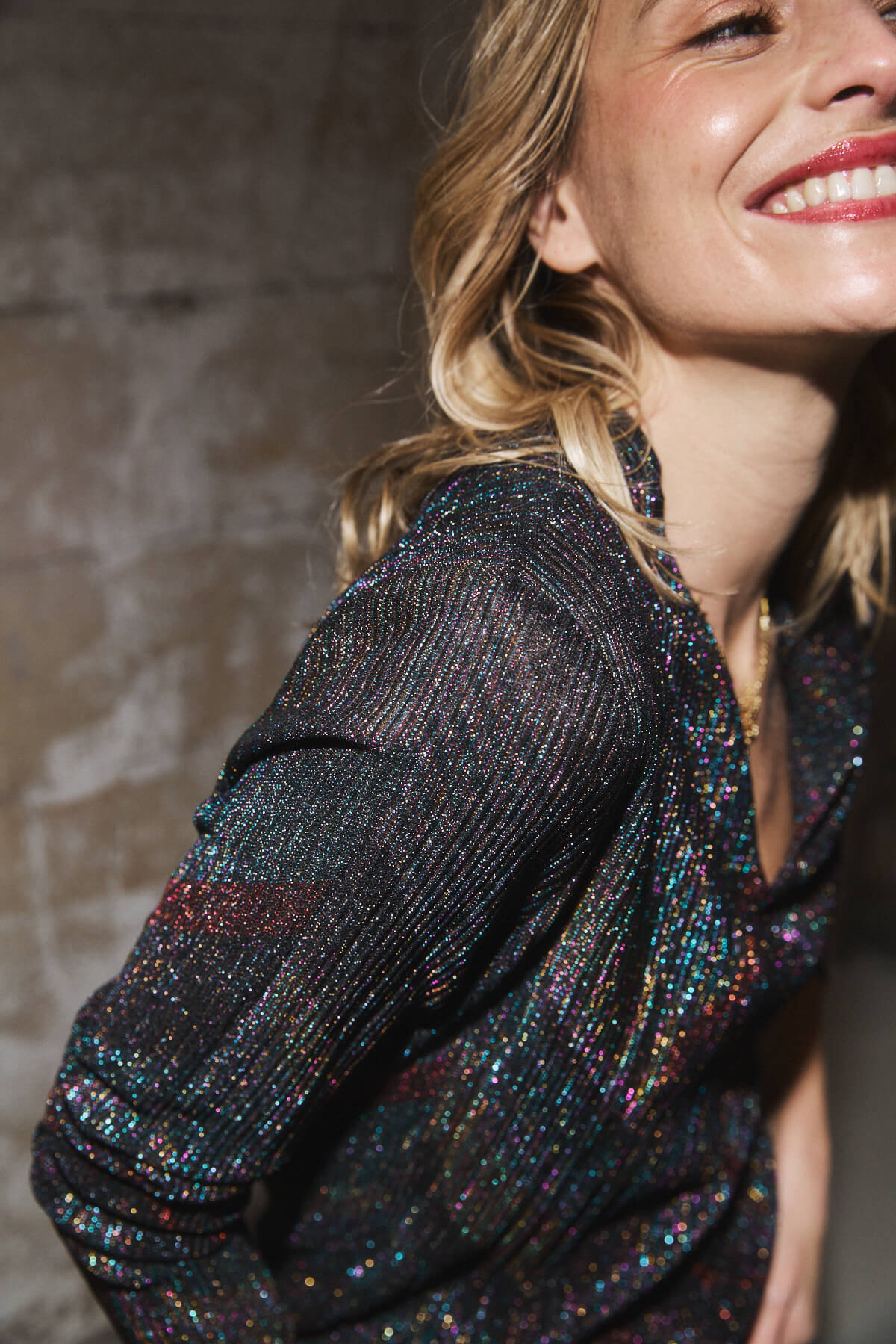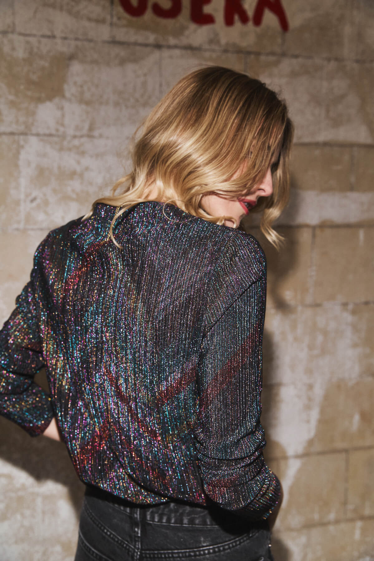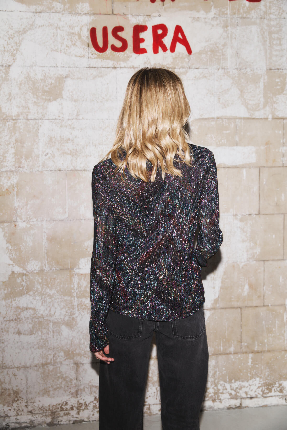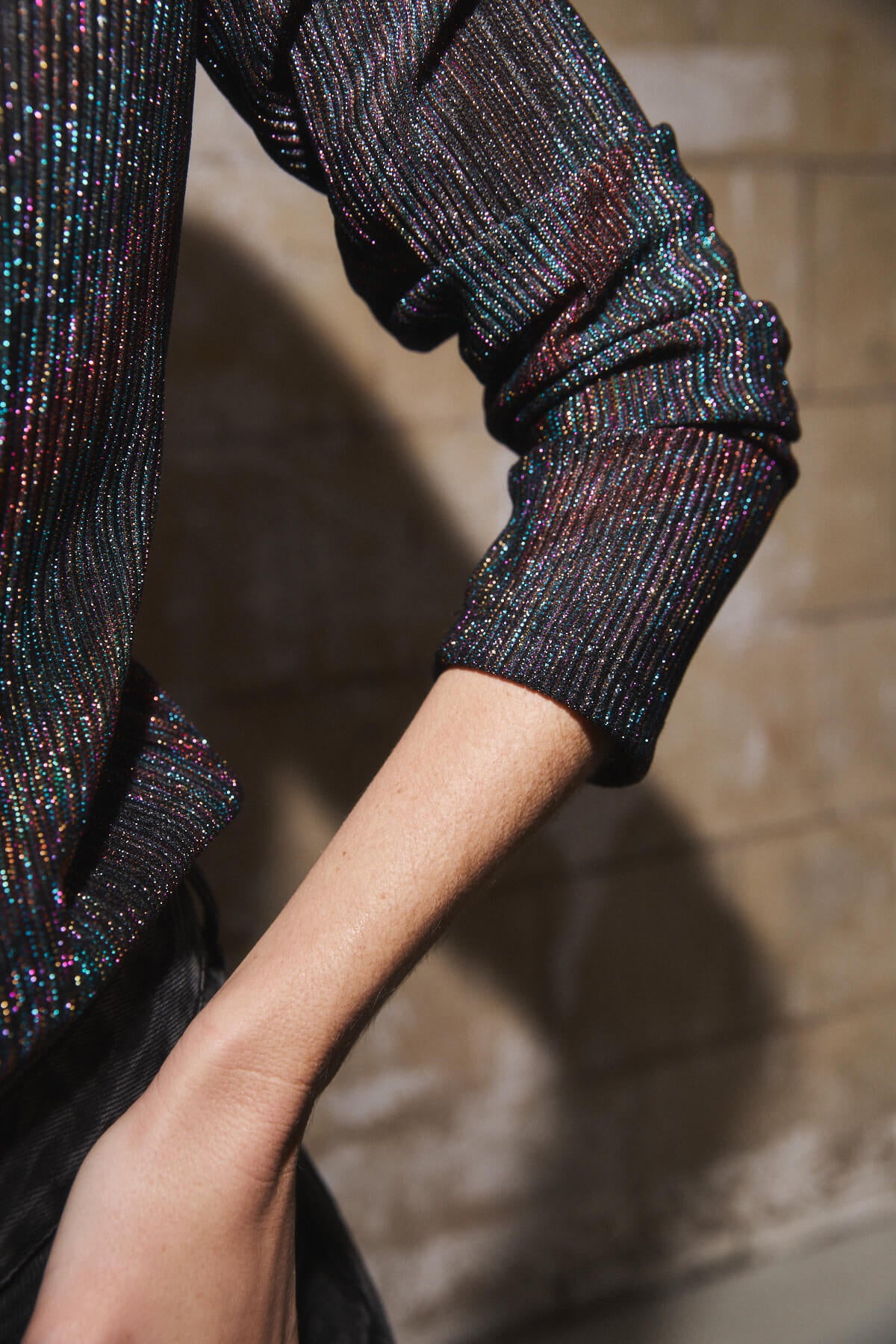 El tejido capta la luz con discreción, creando un efecto delicado que acompaña cada movimiento sin imponerse. Es de esas prendas que no necesitan explicarse: se sienten.