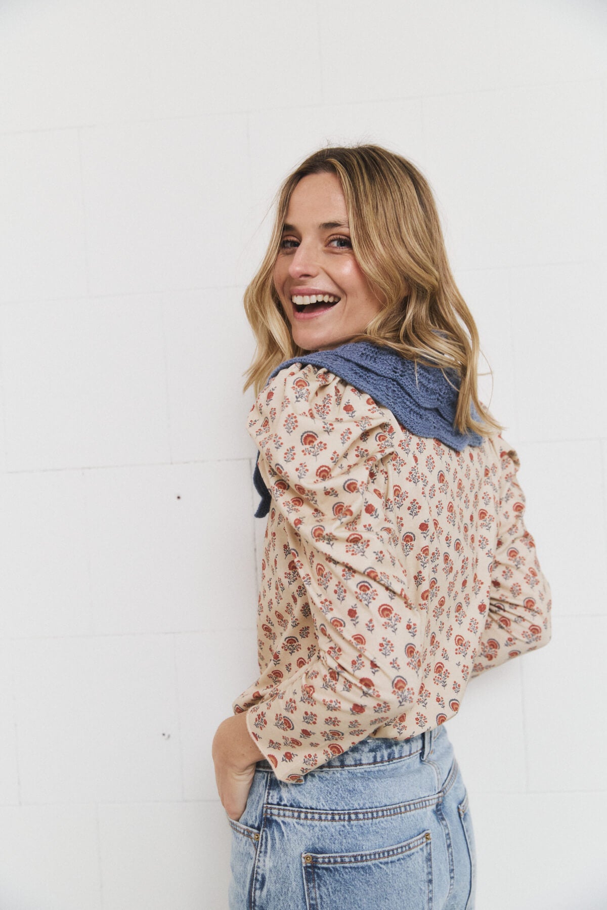 Se apoya suavemente sobre los hombros, con una forma que enmarca el cuello y añade textura al look. Es ideal para llevar sobre camisetas, blusas o vestidos, aportando ese detalle cuidado que marca la diferencia sin esfuerzo.