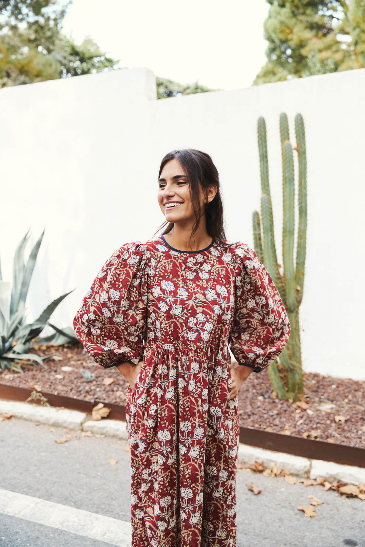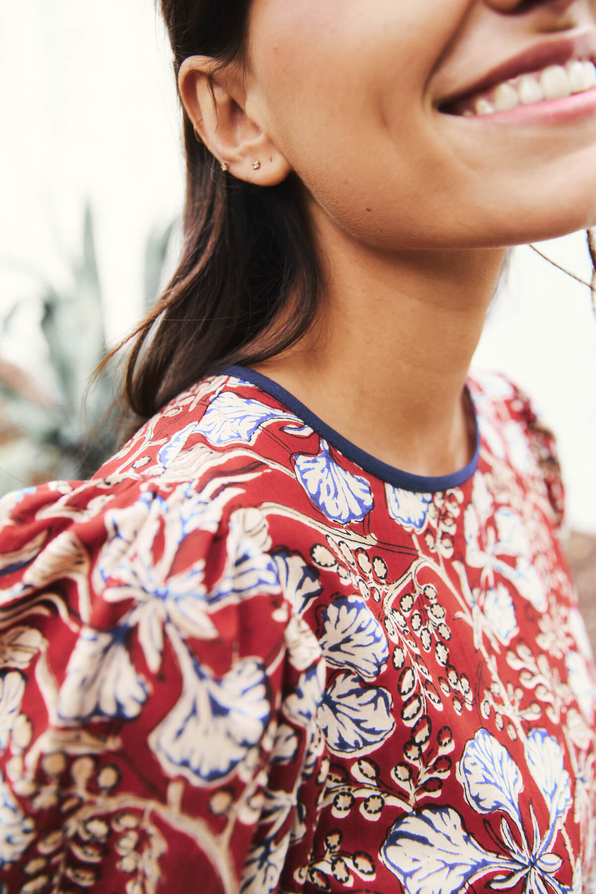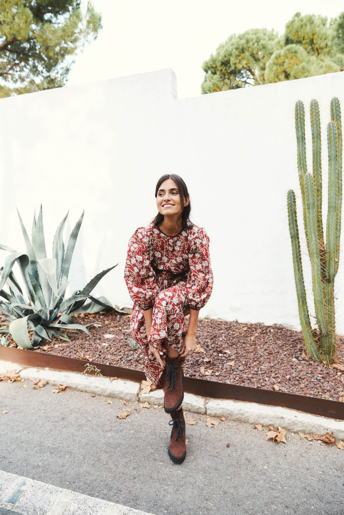 Su estampado floral en tonos granate desprende ese aire retro que nunca pasa de moda.