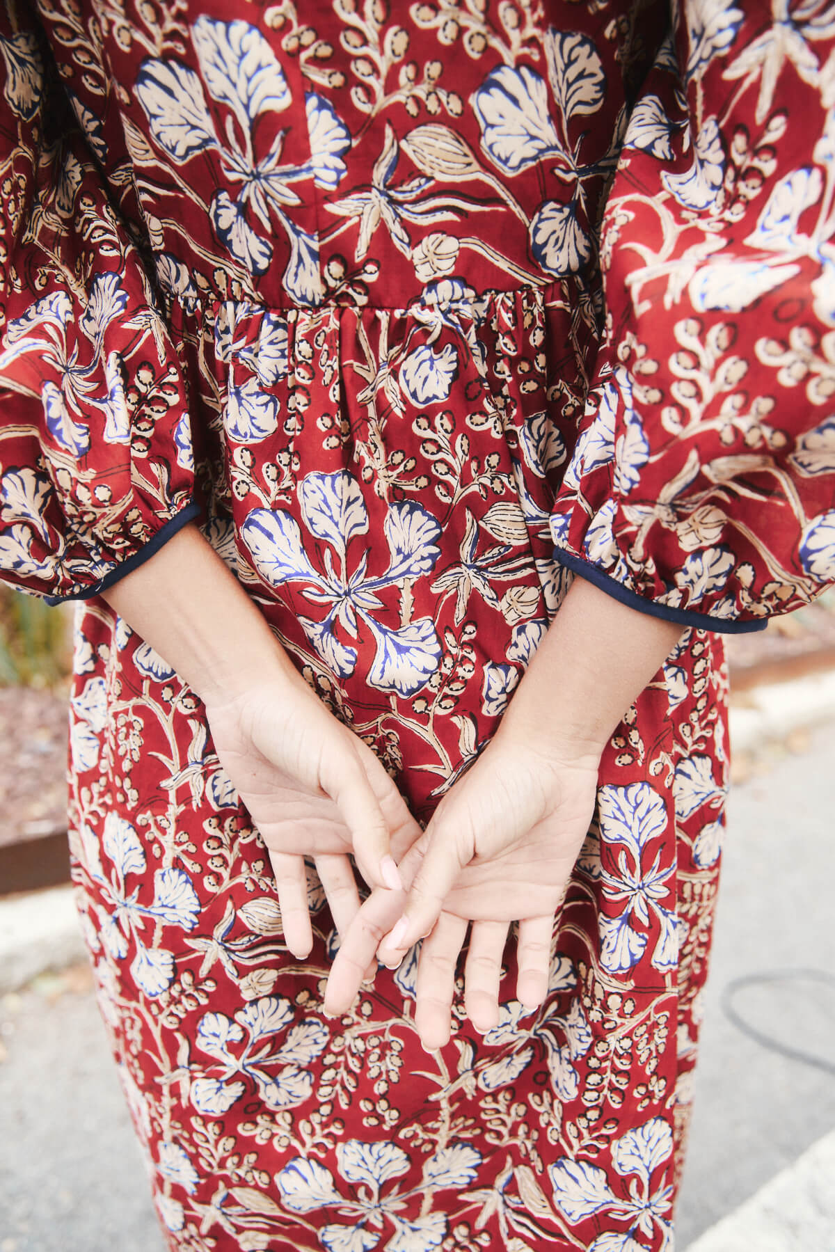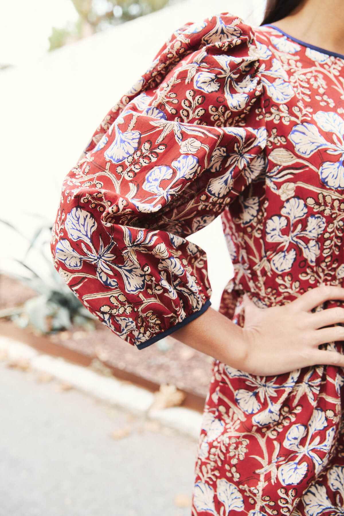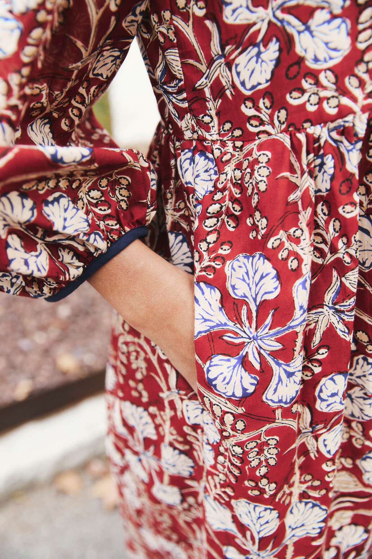 Su estampado floral en tonos granate desprende ese aire retro que nunca pasa de moda.