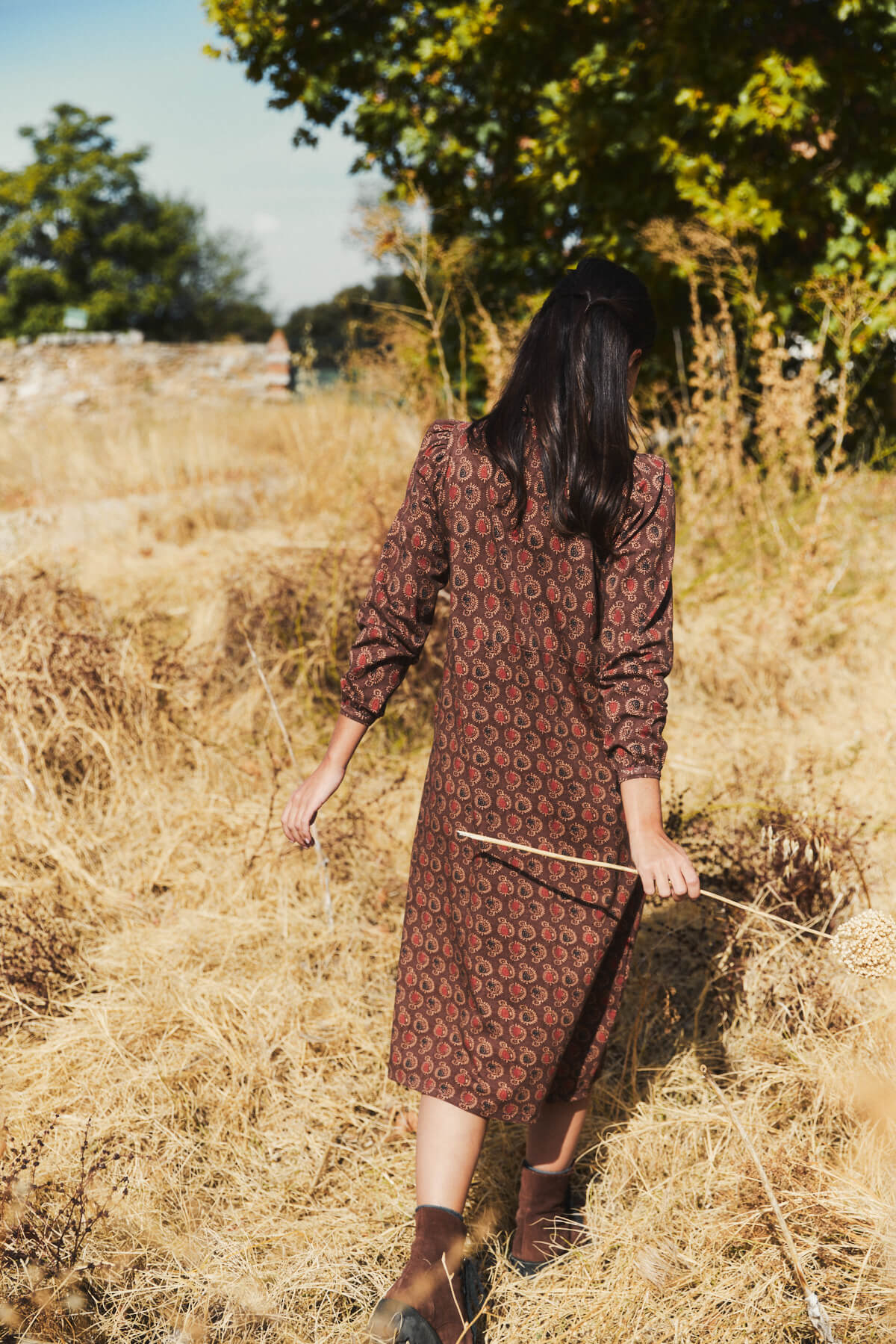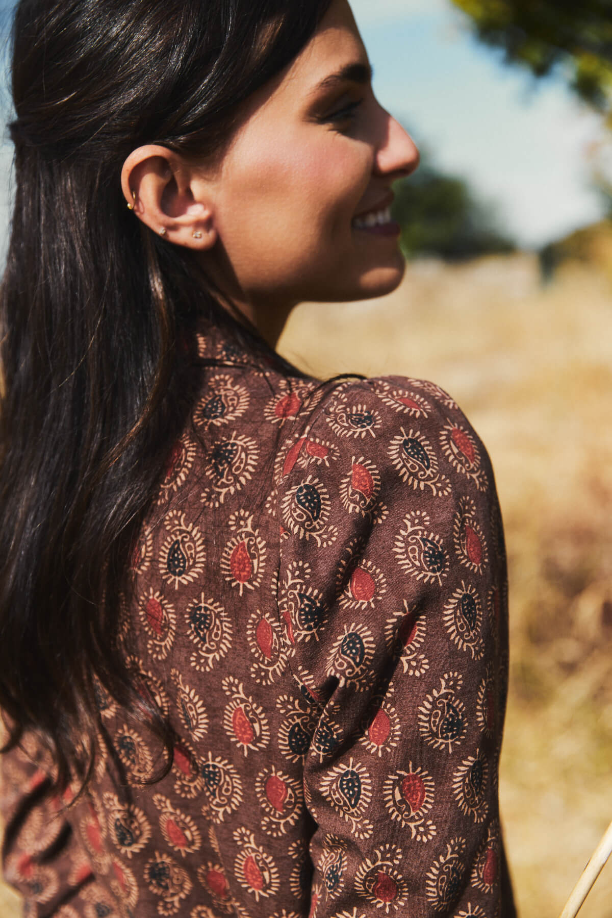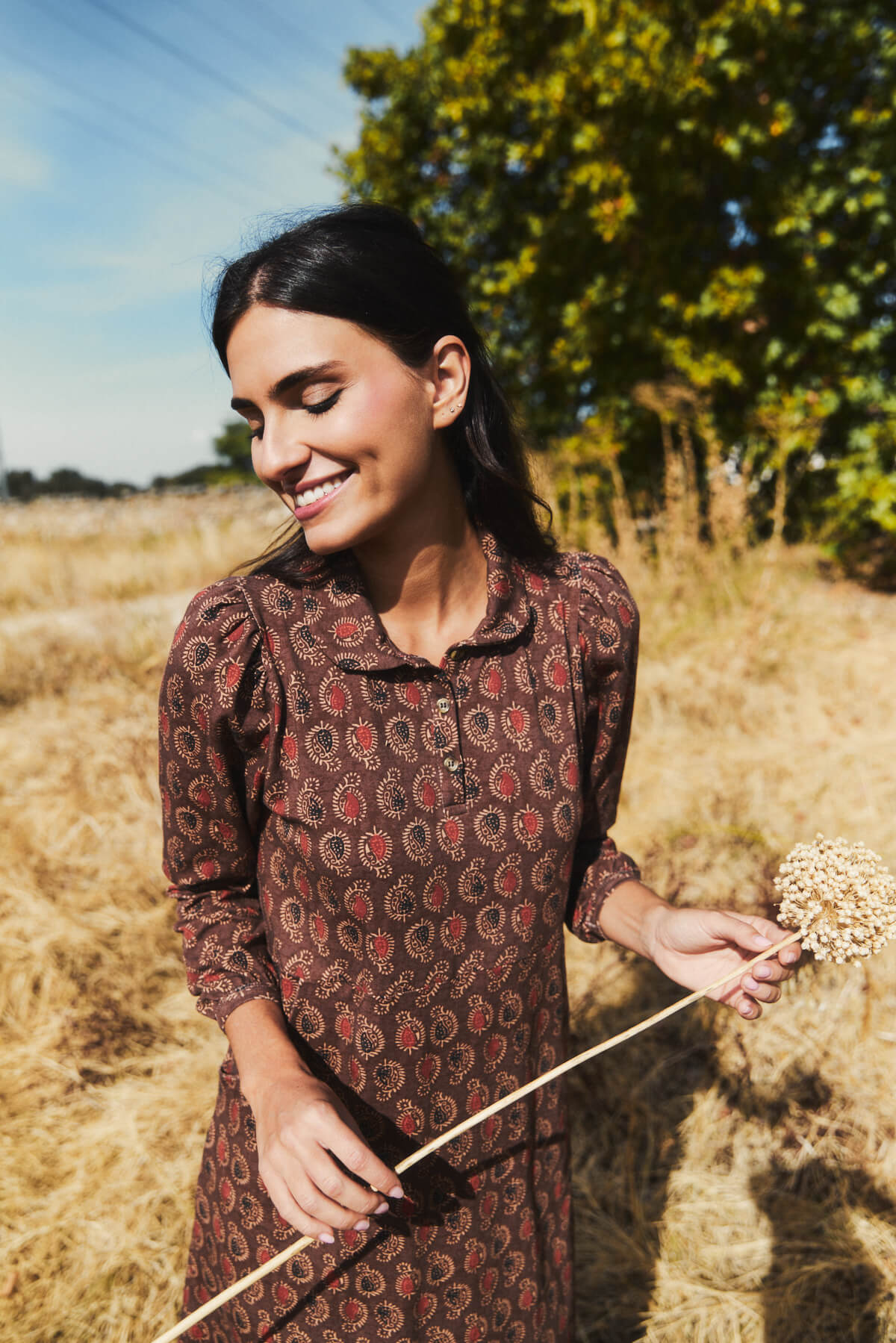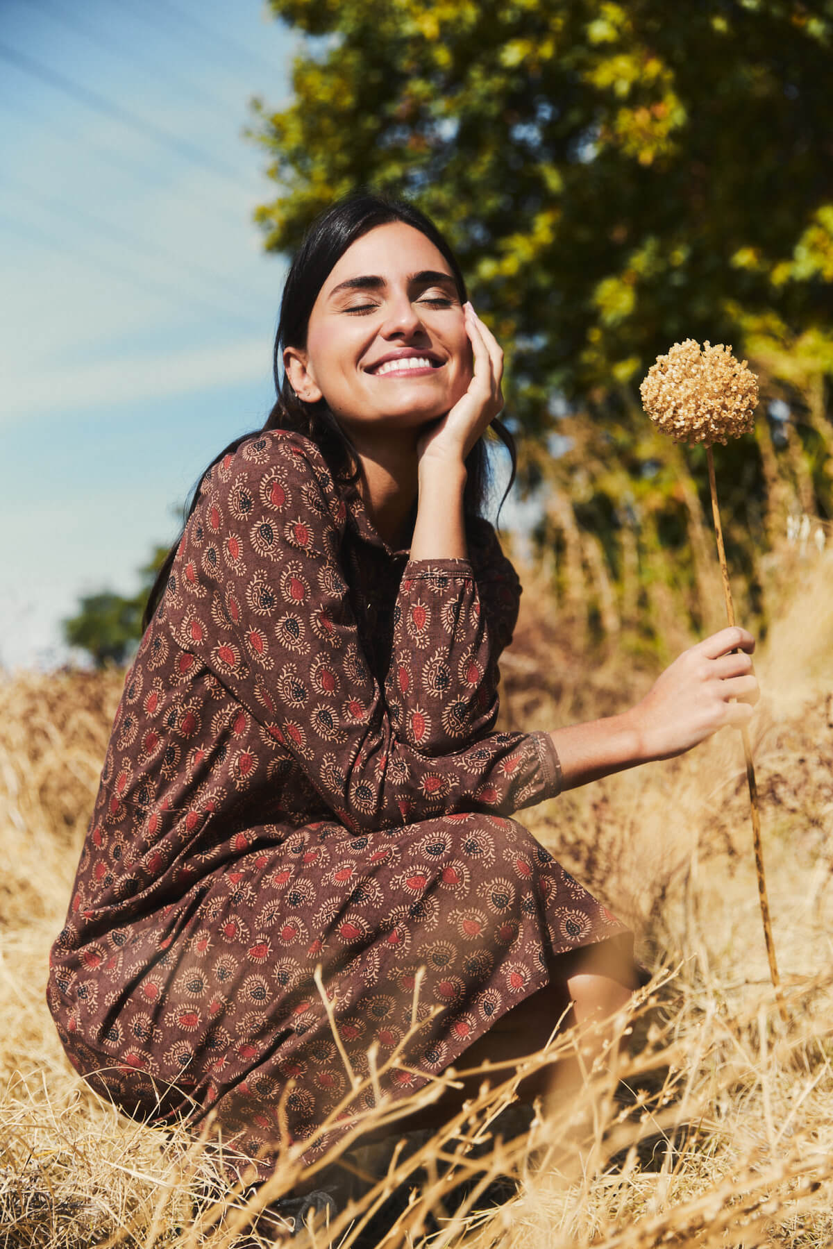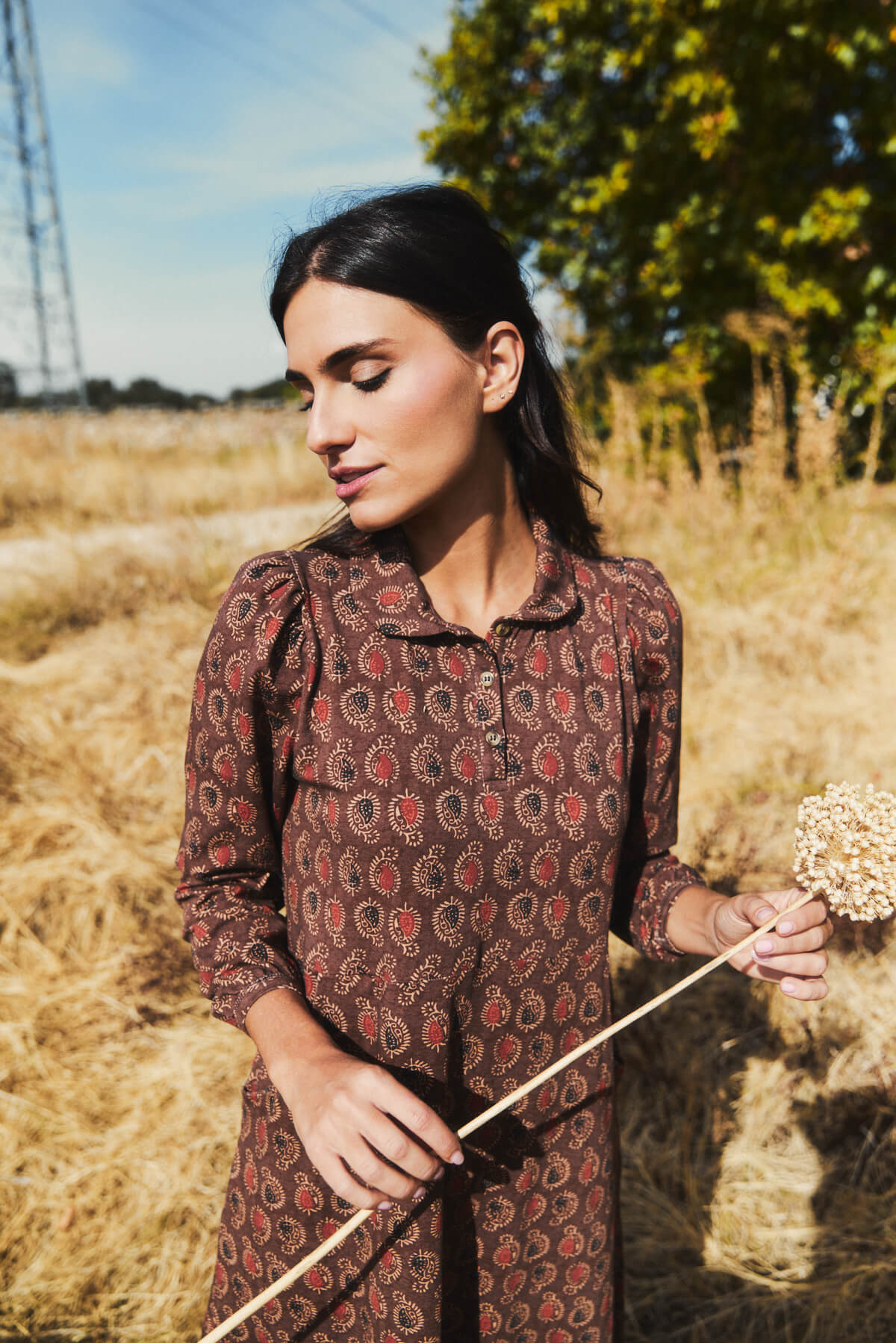 Su estampado étnico en tonos chocolate y burdeos transmite calidez, con ese aire bohemio que se adapta a cualquier día del otoño.