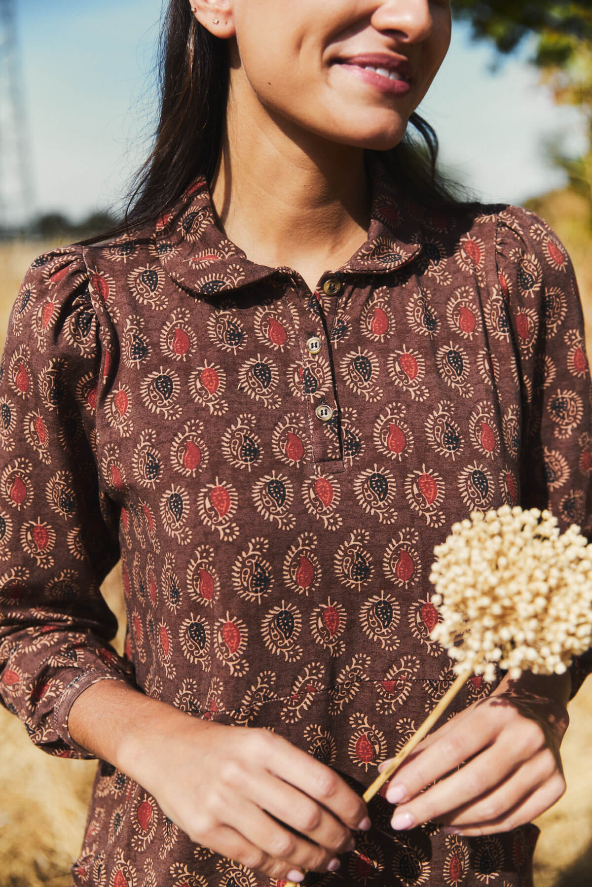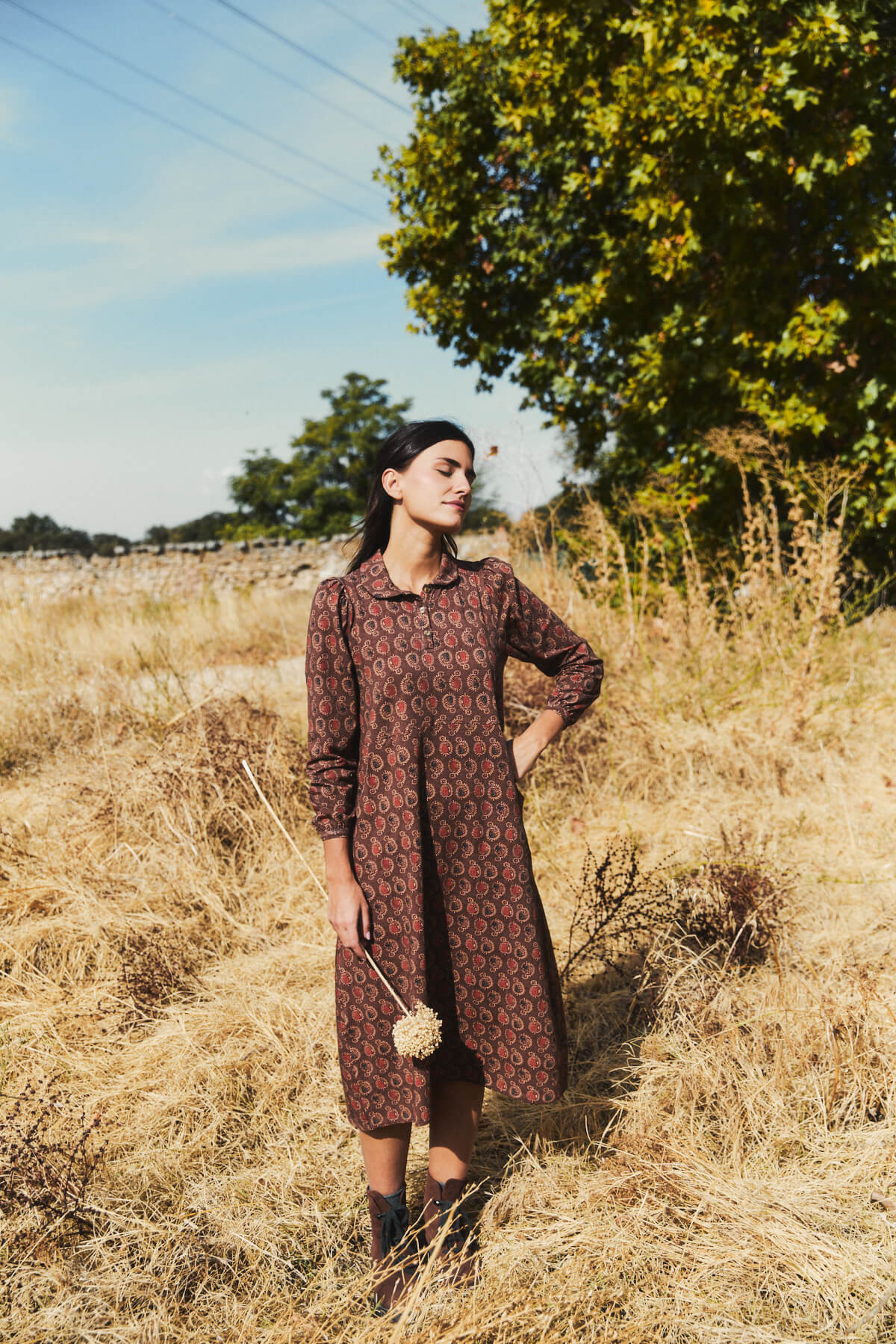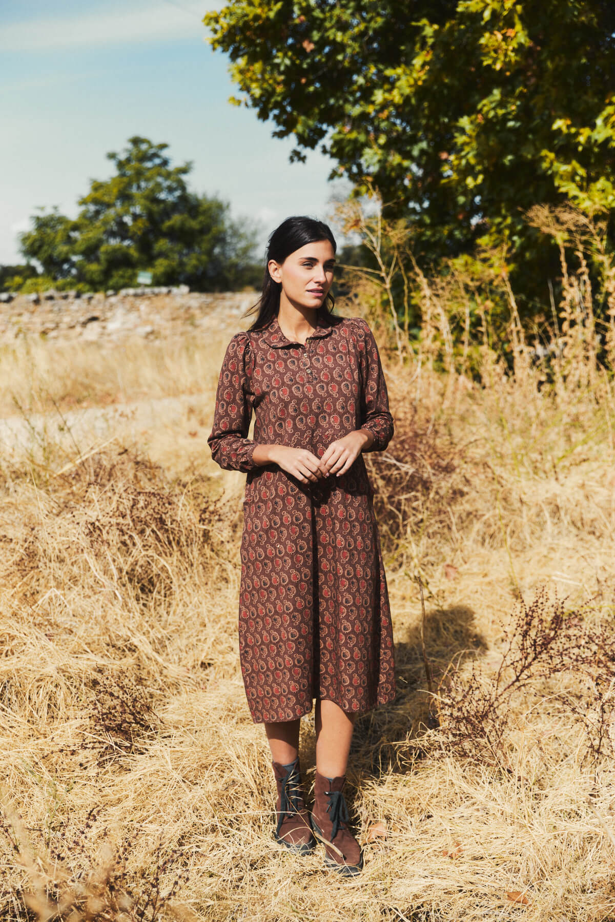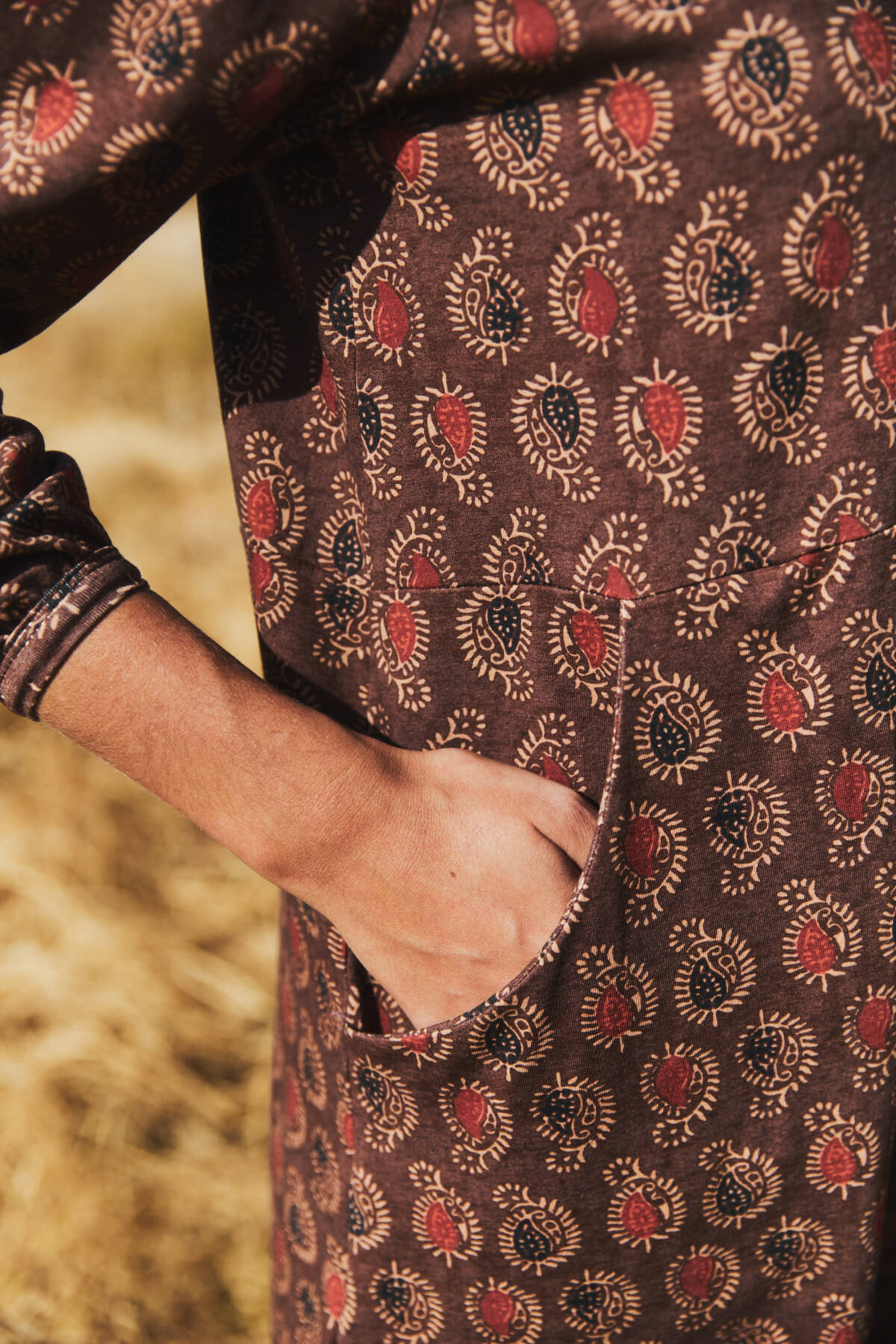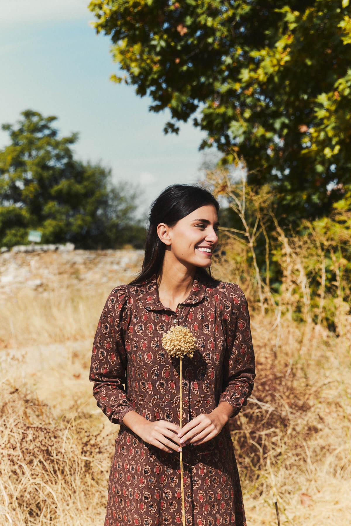 Su estampado étnico en tonos chocolate y burdeos transmite calidez, con ese aire bohemio que se adapta a cualquier día del otoño.