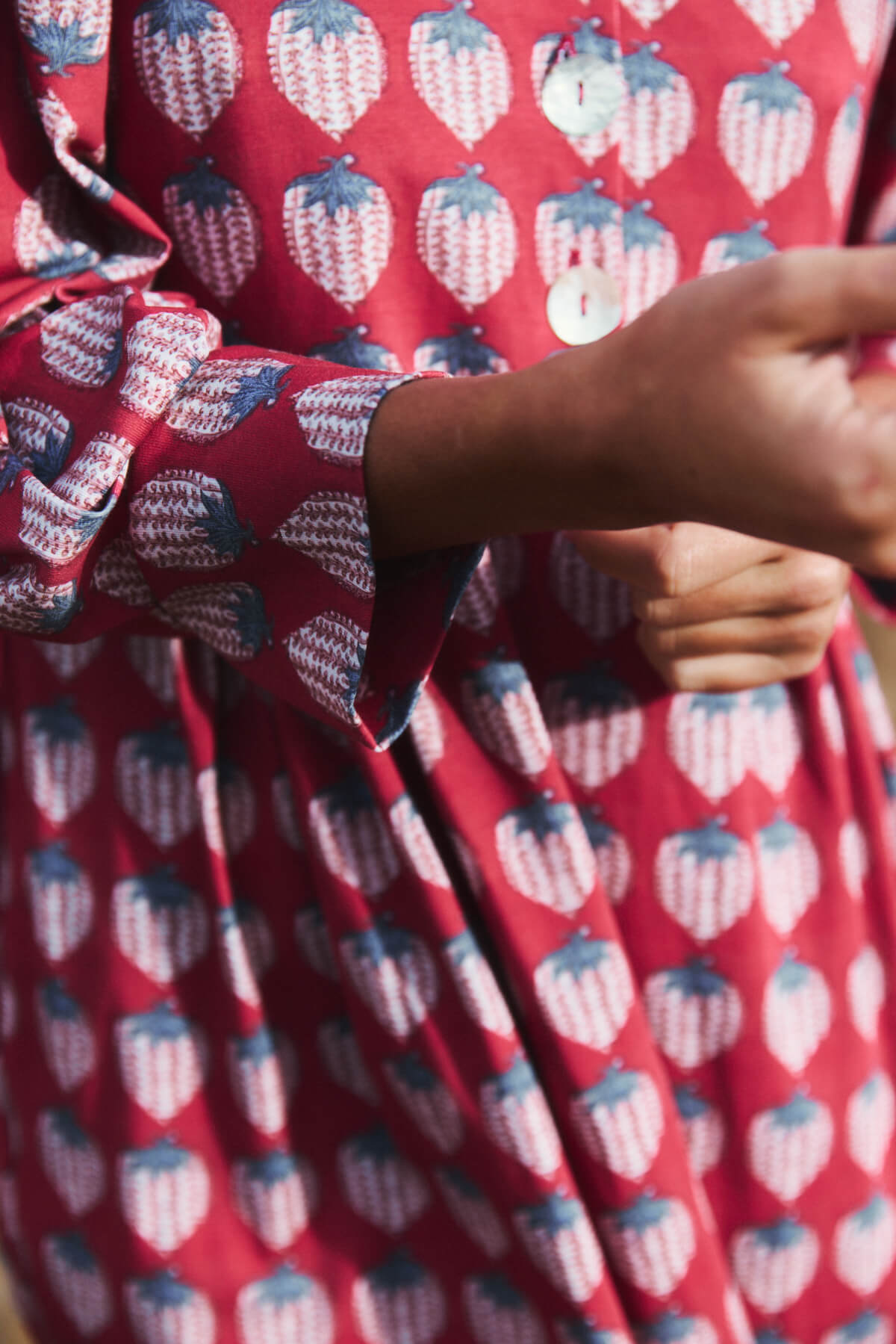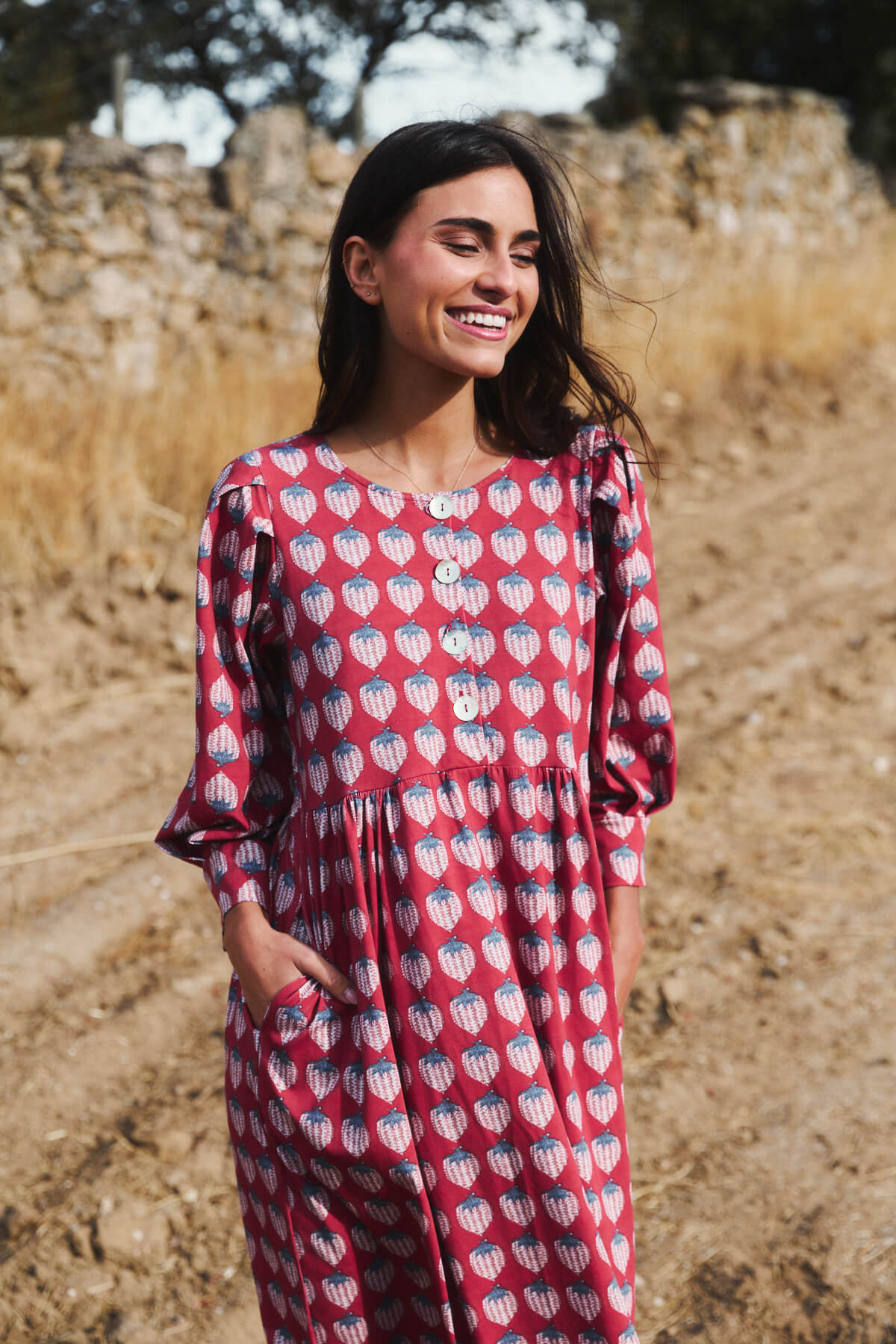 De corte midi, con falda de vuelo y botones delanteros, su diseño combina comodidad y estilo en partes iguales.
