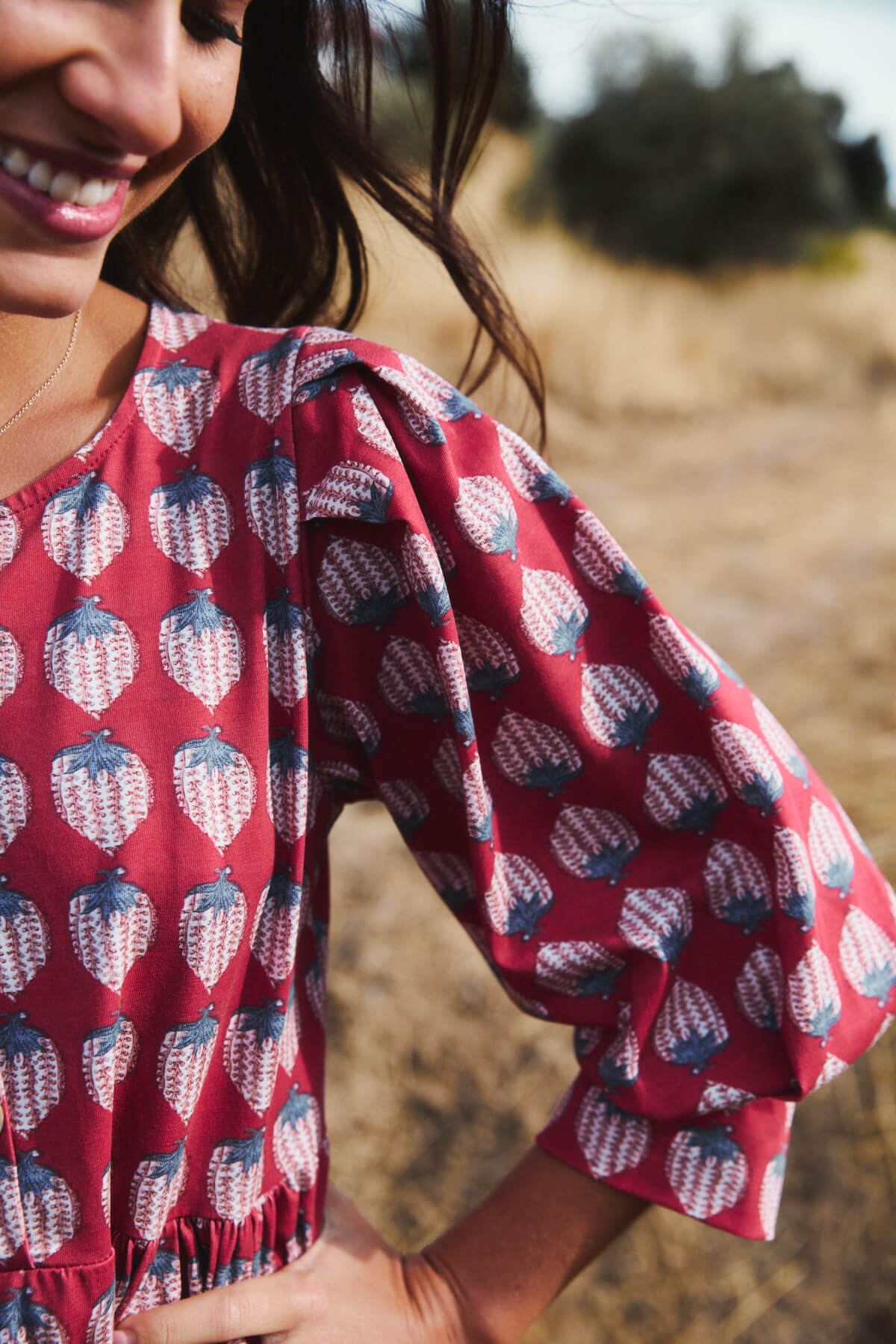 Las mangas ligeramente abullonadas y el detalle de los puños le aportan carácter y movimiento.