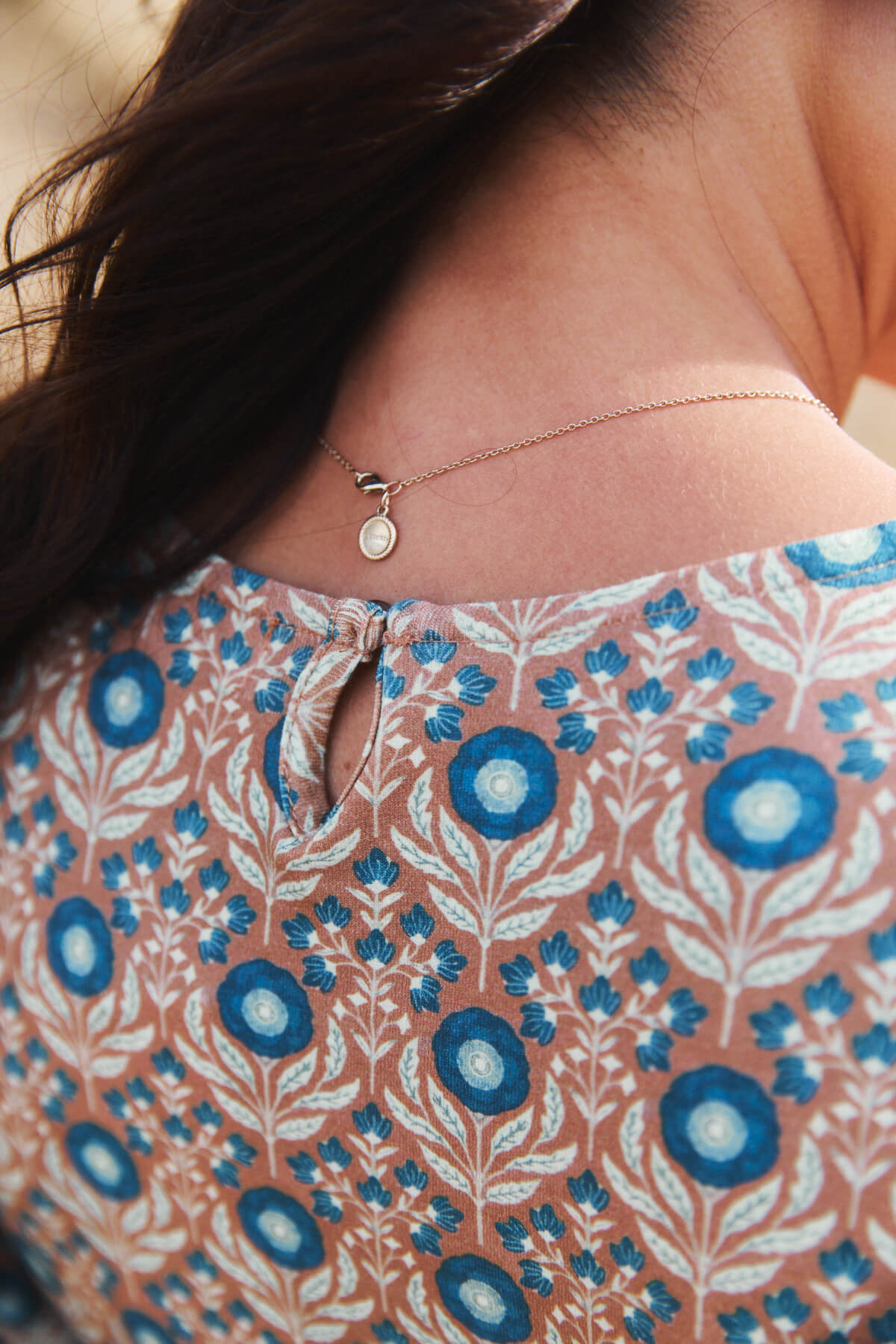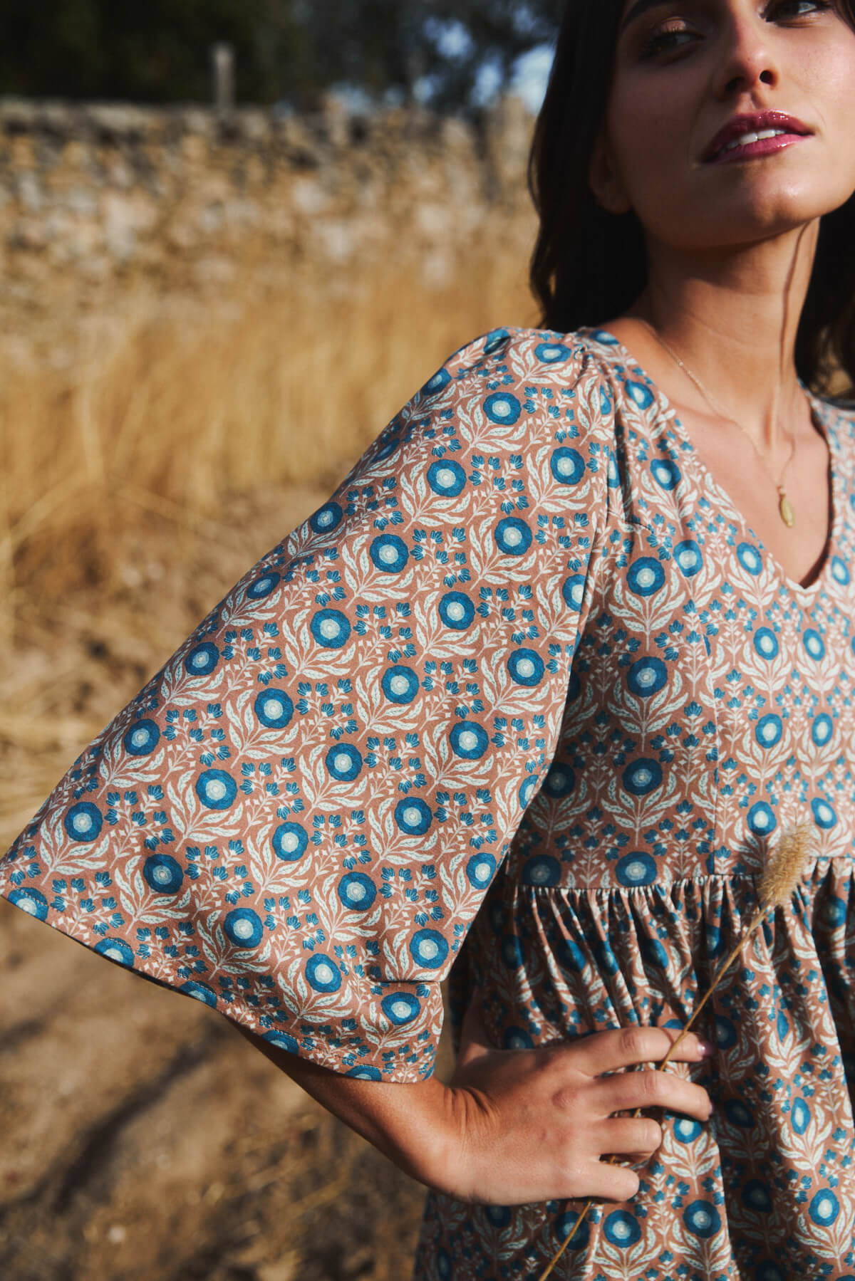 Su estampado floral en tonos azul y café aporta ese equilibrio perfecto entre lo bohemio y lo elegante, ideal para los días largos y los planes tranquilos.