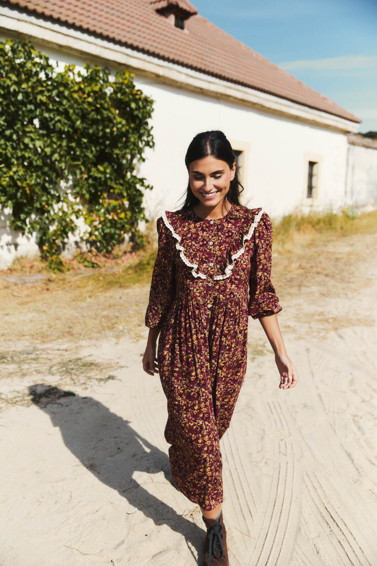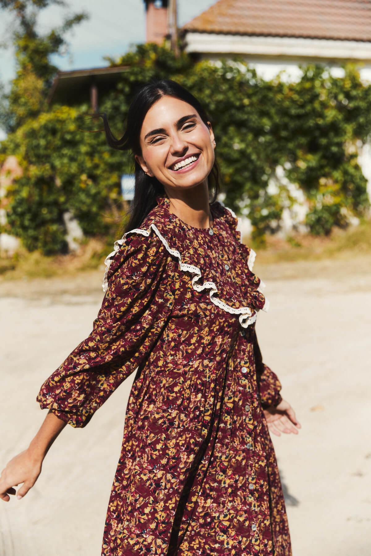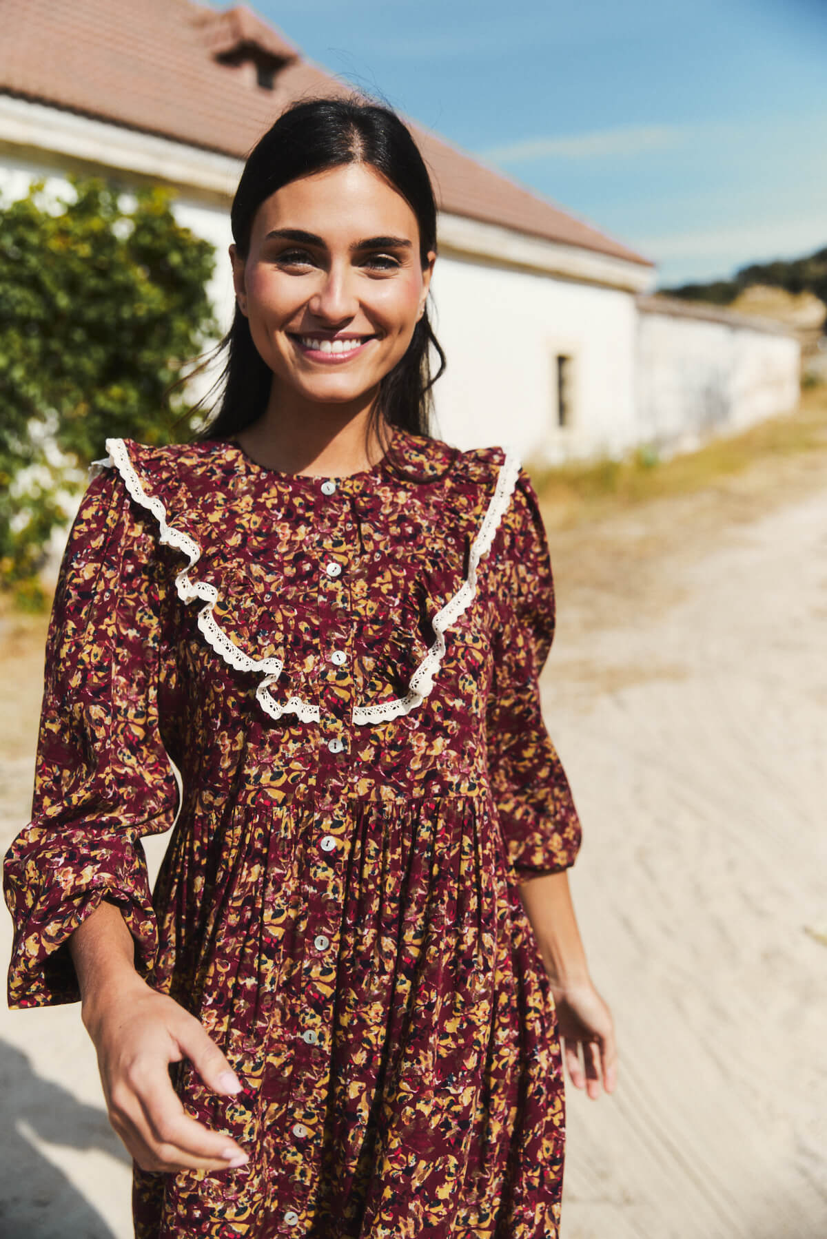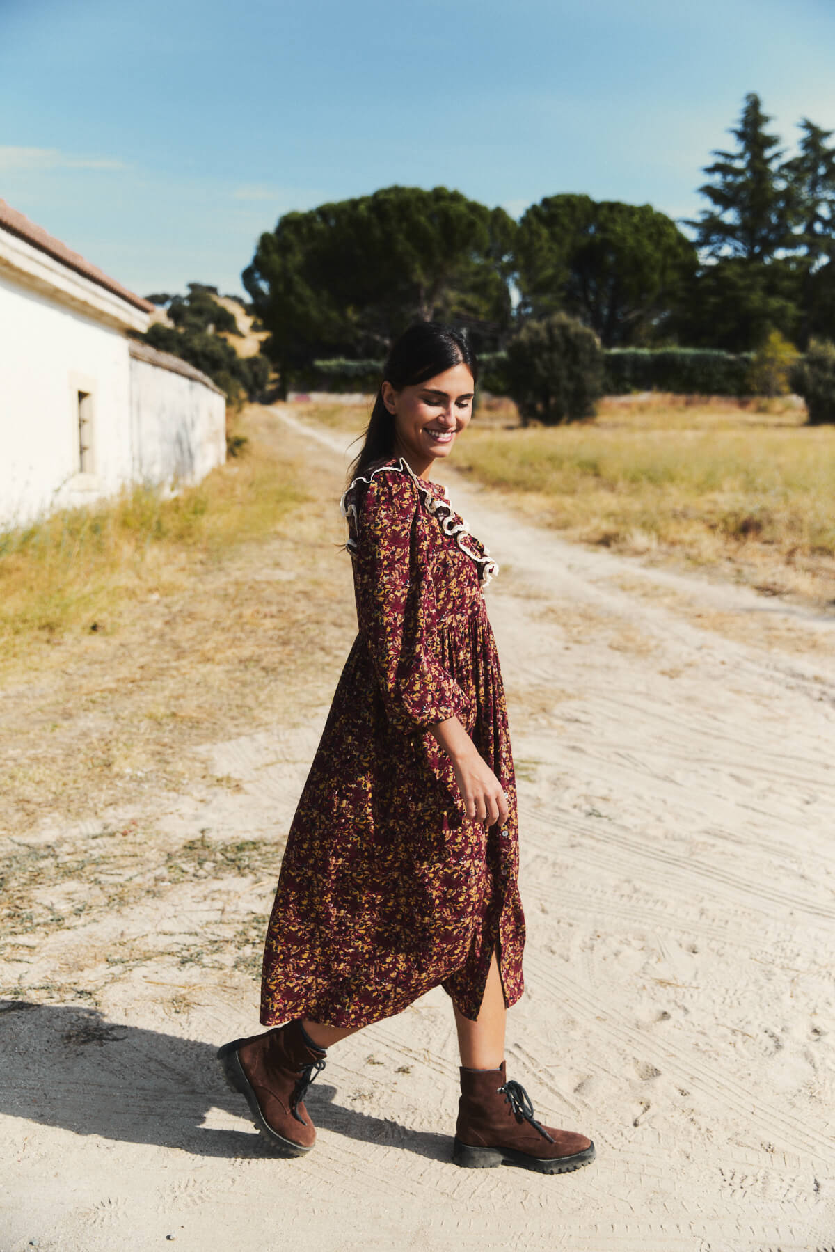 Su estampado floral en tonos granate, crudo y mostaza ilumina la silueta con un aire romántico y natural, perfecto para el día a día.