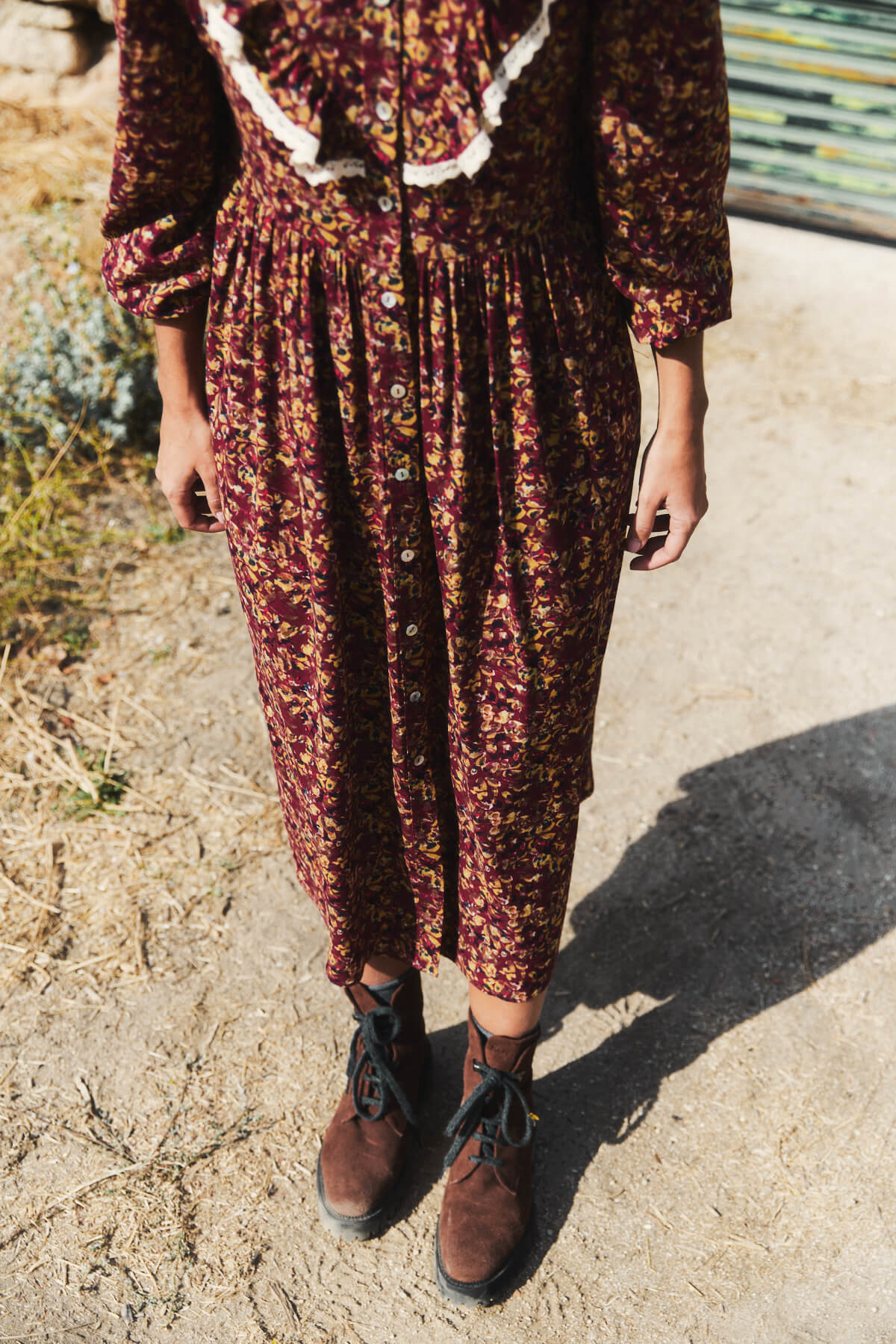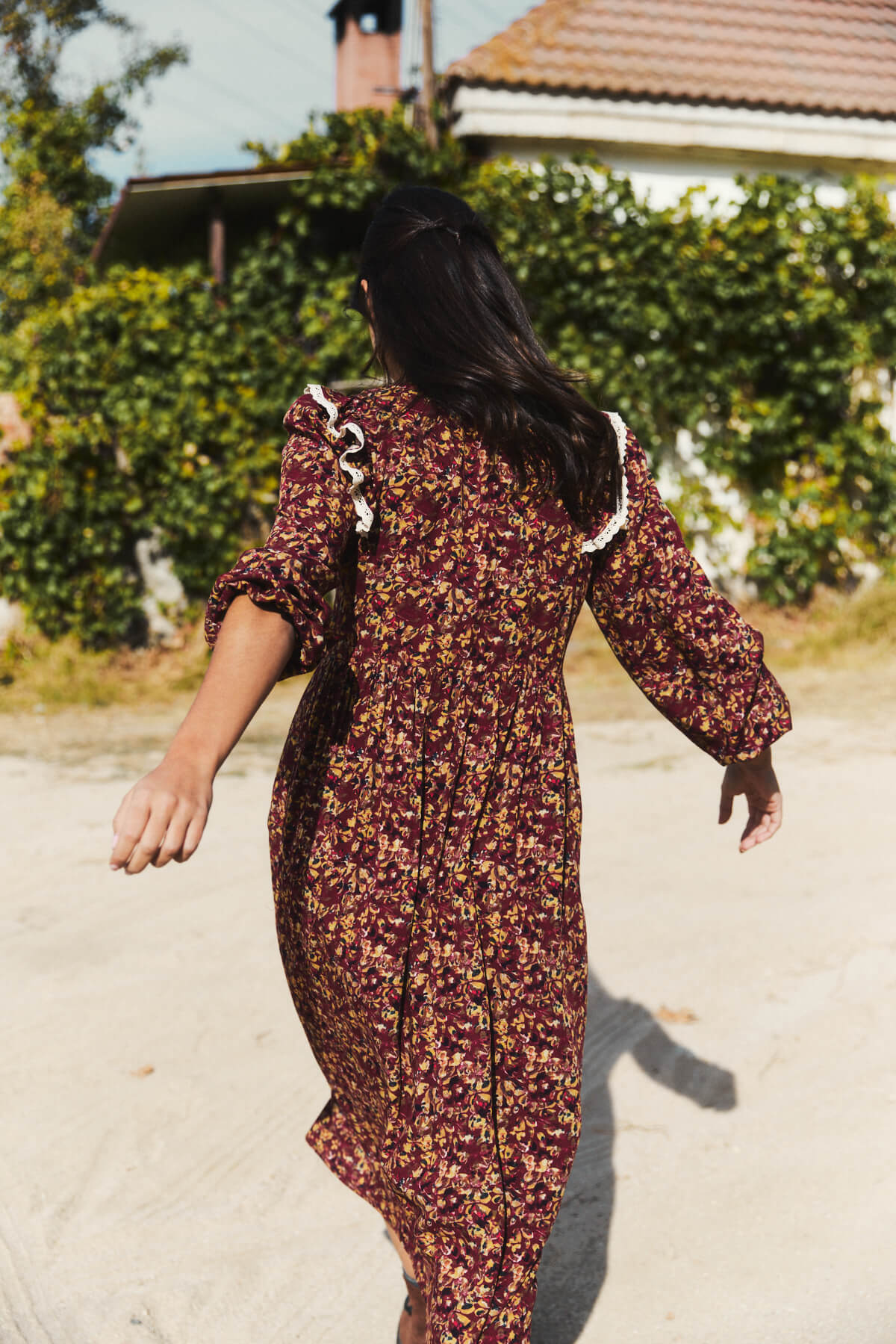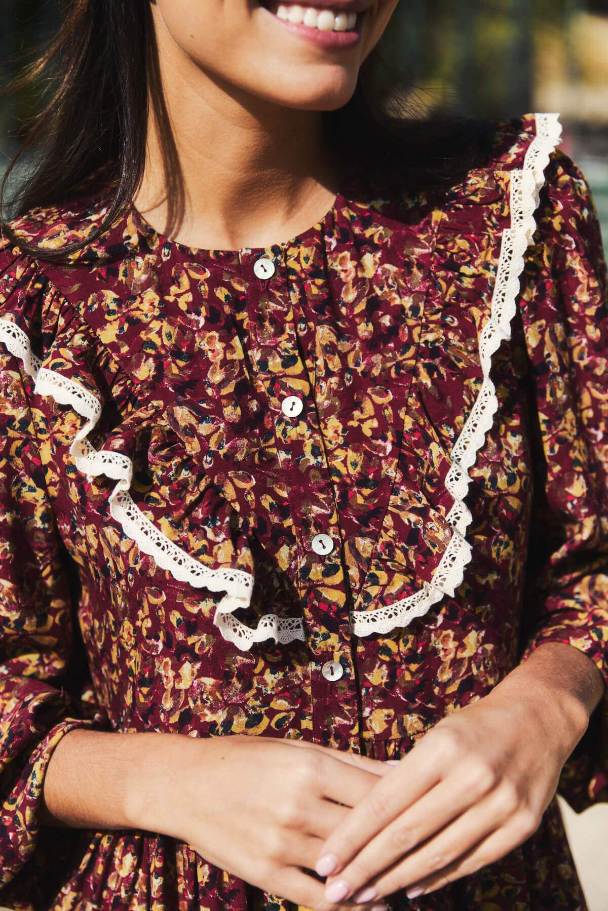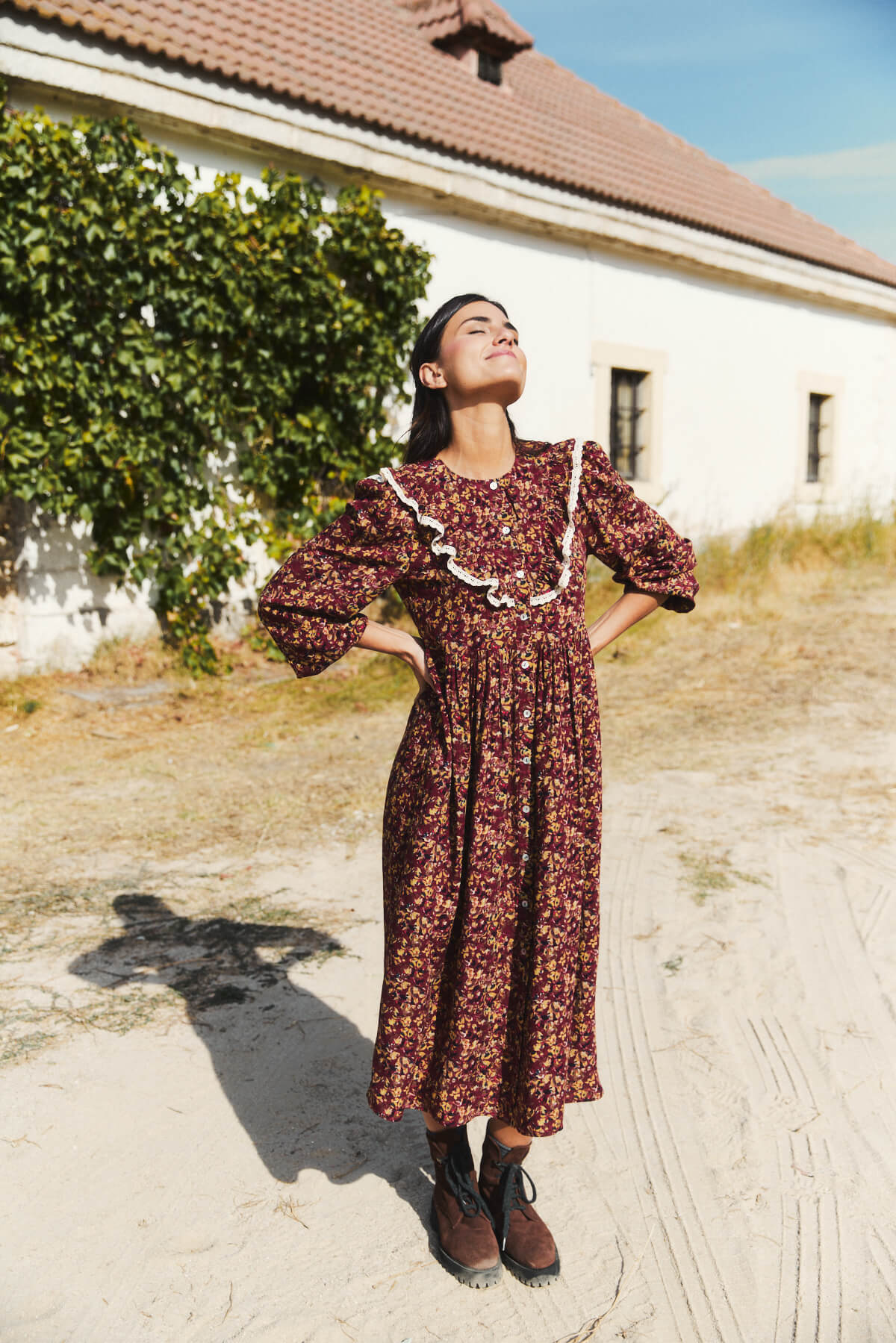Su estampado floral en tonos granate, crudo y mostaza ilumina la silueta con un aire romántico y natural, perfecto para el día a día.